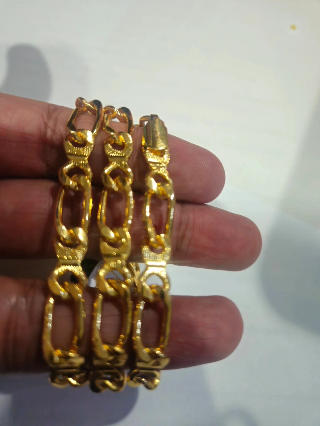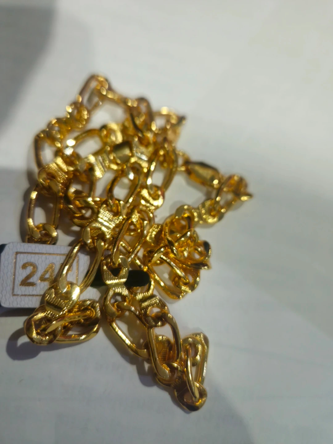 A stunning 24K gold plated chain bracelet with an intricate link design. It's crafted for a comfortable fit and secure clasp. This piece adds a touch of elegance to any outfit!
