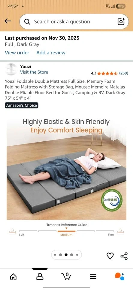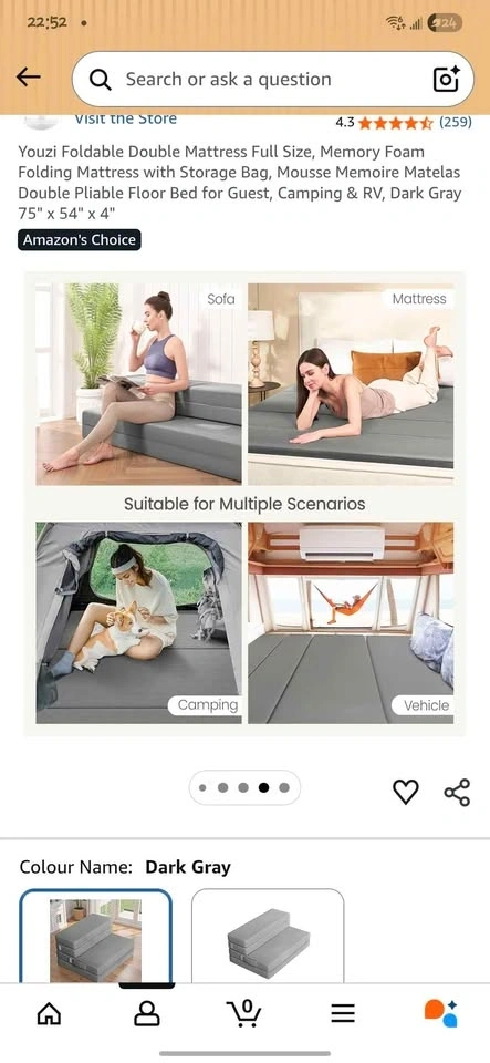 Versatile Youzi foldable double mattress. Full size, dark gray memory foam. Super comfy for guests, camping, or RV trips. Also works great as a floor bed or a sofa when folded up. Has a removable and washable cover, breathable fabric, and a smooth zipper. Dimensions are 75" x 54" x 4" as a mattress, or 53" x 24.6" x 16" as a sofa.