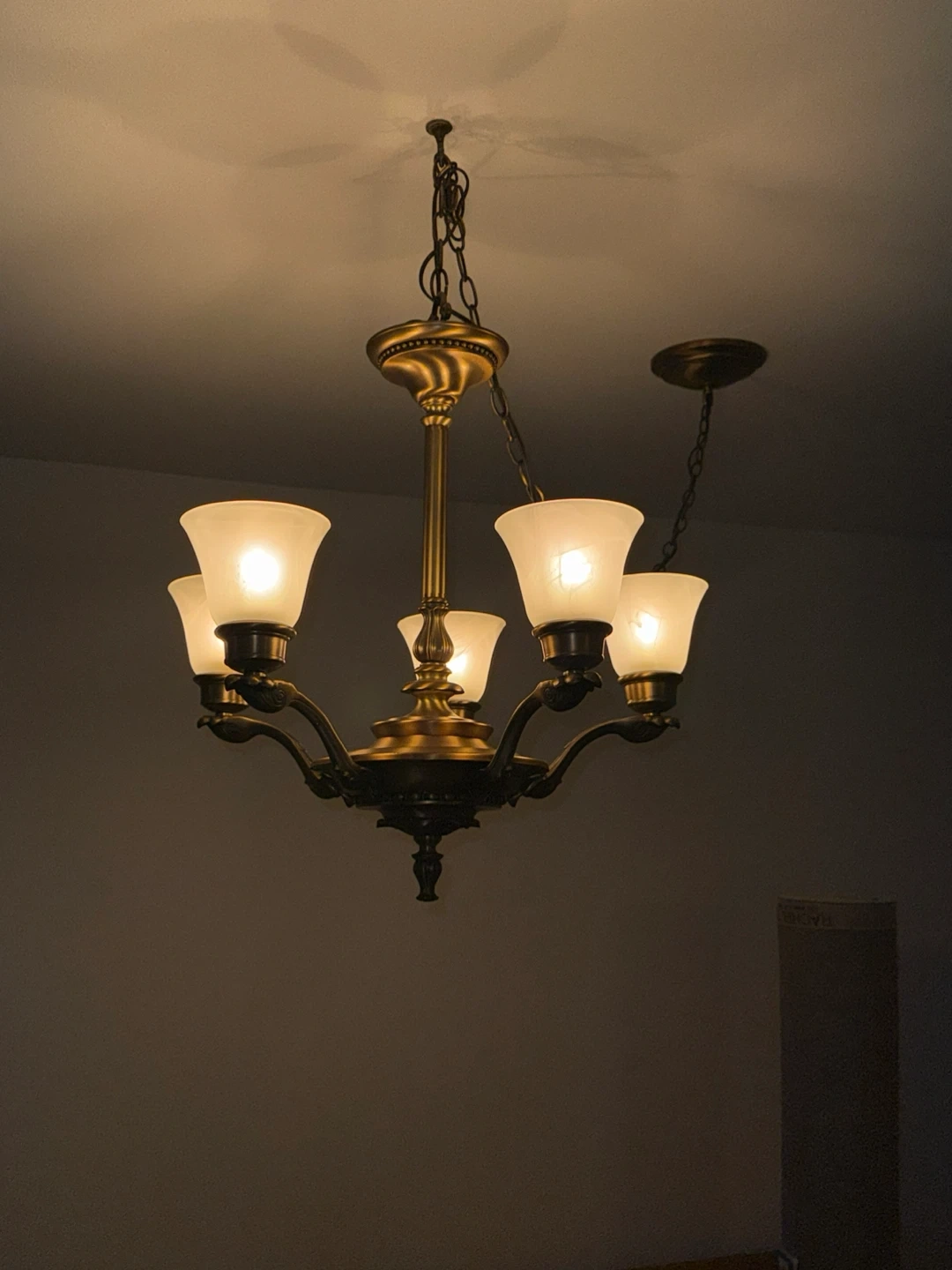 Brass finish chandelier with five frosted glass shades. This fixture provides warm ambient lighting. Perfect for dining rooms or living areas!
