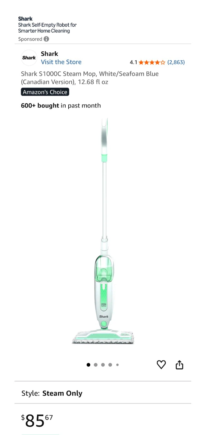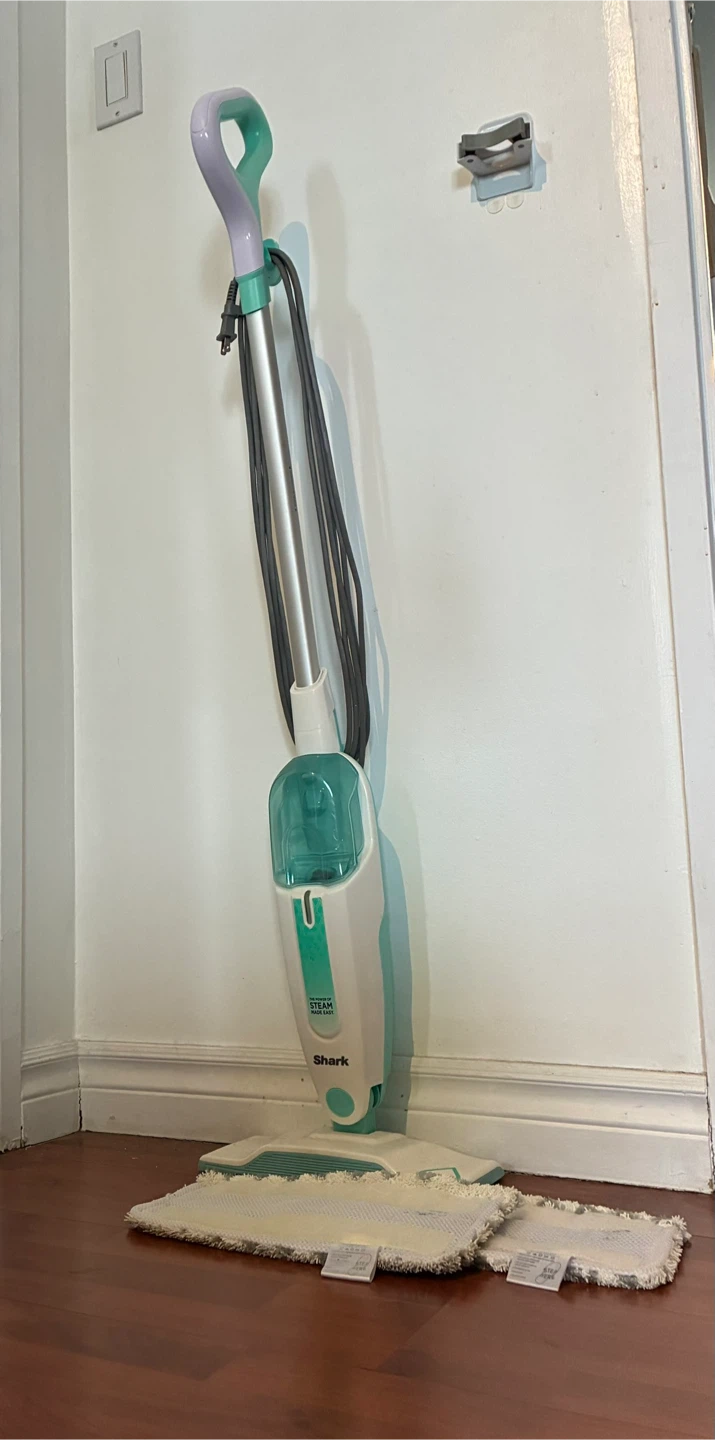 I'm selling a Shark S1000C steam mop in a fresh white and seafoam blue colour. It's in great shape and ready to help you keep your floors sparkling clean. It's lightweight and portable, making it easy to use and store. Comes with the 2 mop pads shown in the picture
