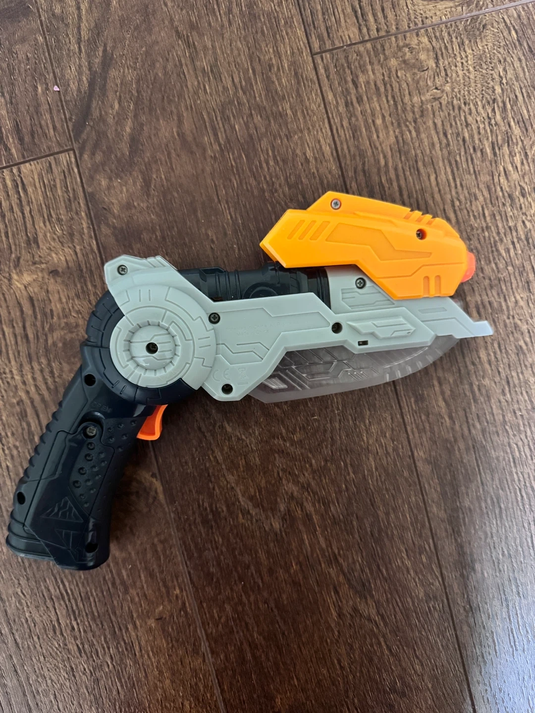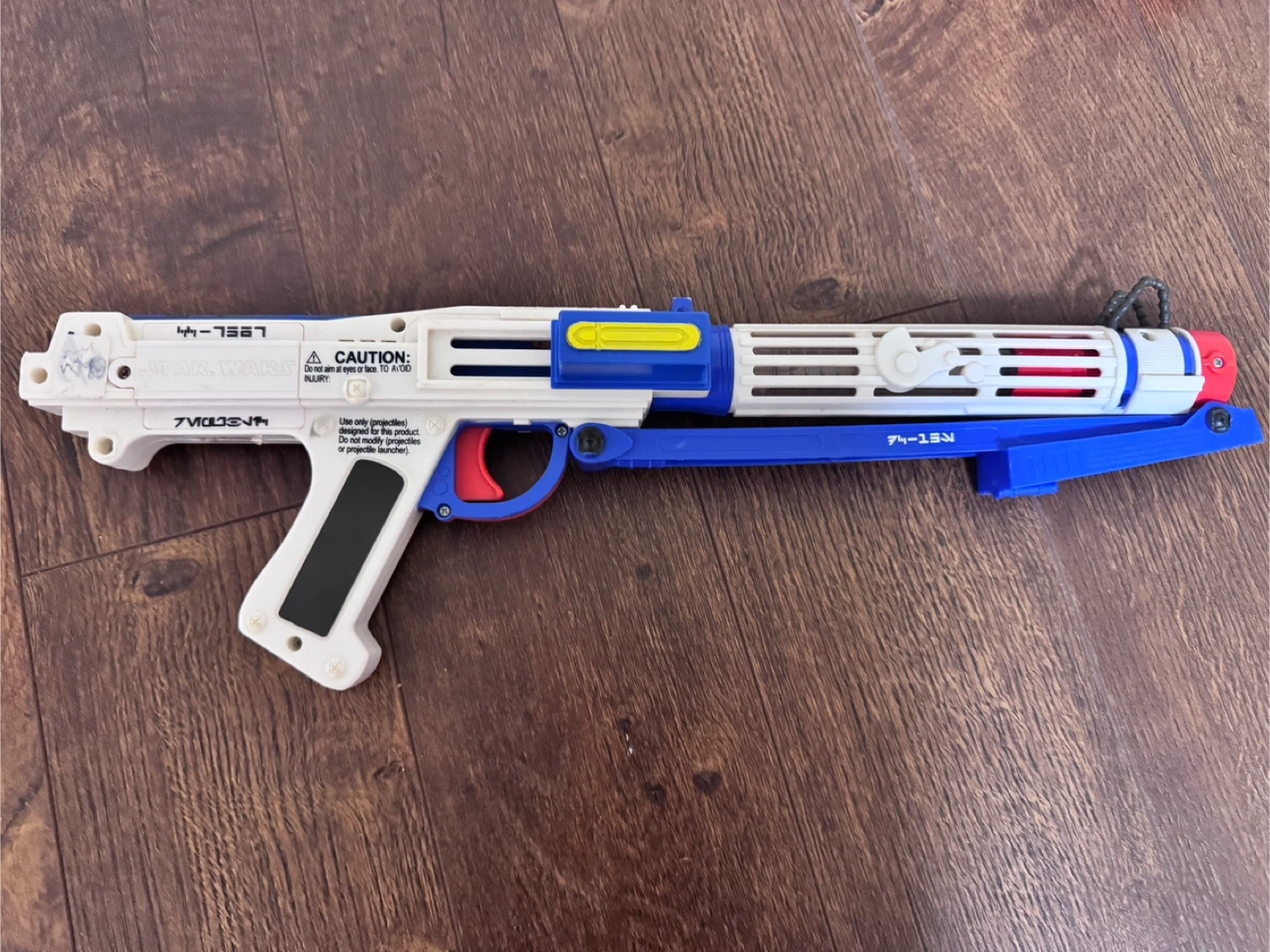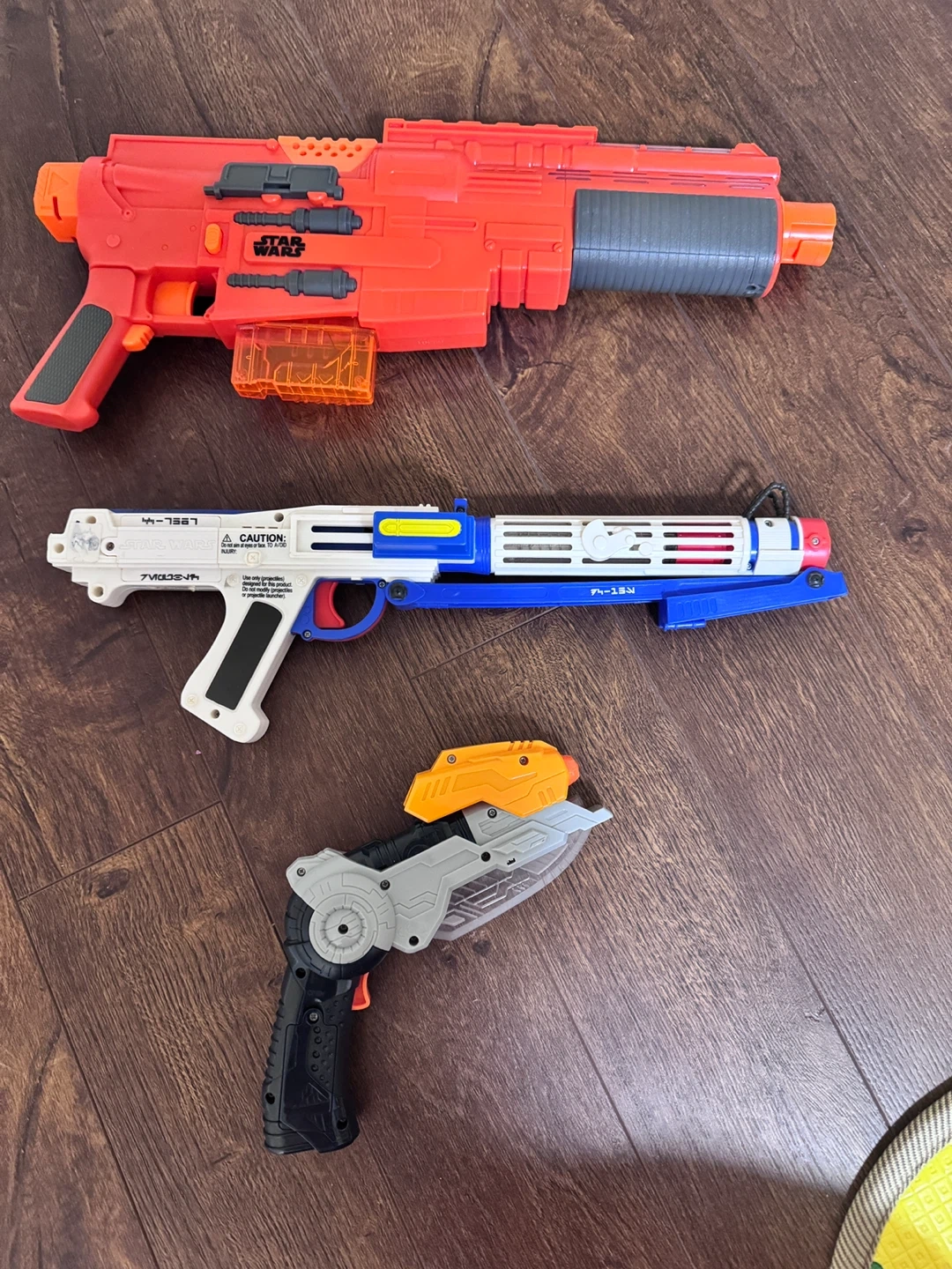 Three Star Wars themed blaster toy guns. Includes one orange and grey blaster with a clear attachment, one white and blue blaster with a detachable stock, and one red and grey blaster with a removable magazine. They're fun for play or collecting!