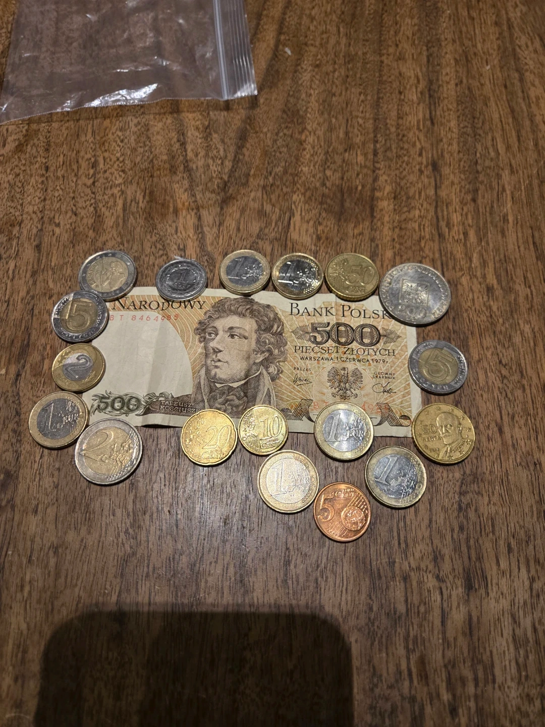 Selling a Polish banknote with a face value of 500 zlotych, surrounded by various euro coins. The banknote features the inscription 'Bank Polski' and 'Narodowy'. A unique piece for collectors or anyone interested in