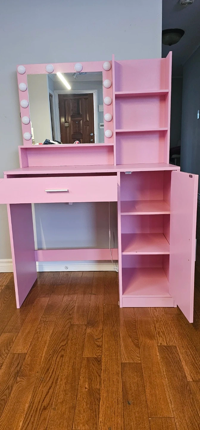 Stylish pink vanity table with morror. It offers a large drawer and 3-level storage for your makeup station. This desk has ample space with a cabinet and open shelving.