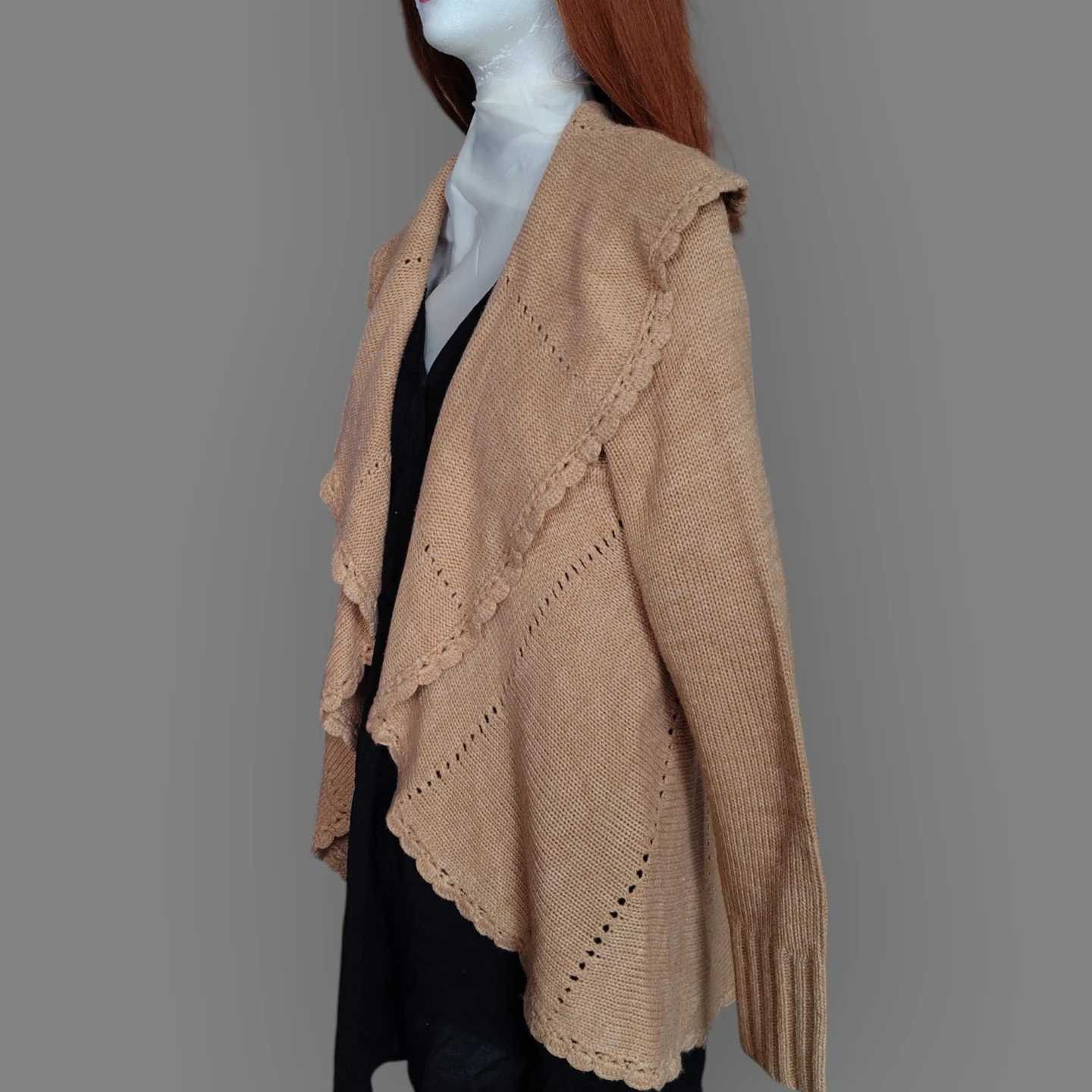 Cozy tan knit cardigan with a unique textured collar. It features a relaxed fit and open-front design. This sweater is perfect for layering on cooler days.
