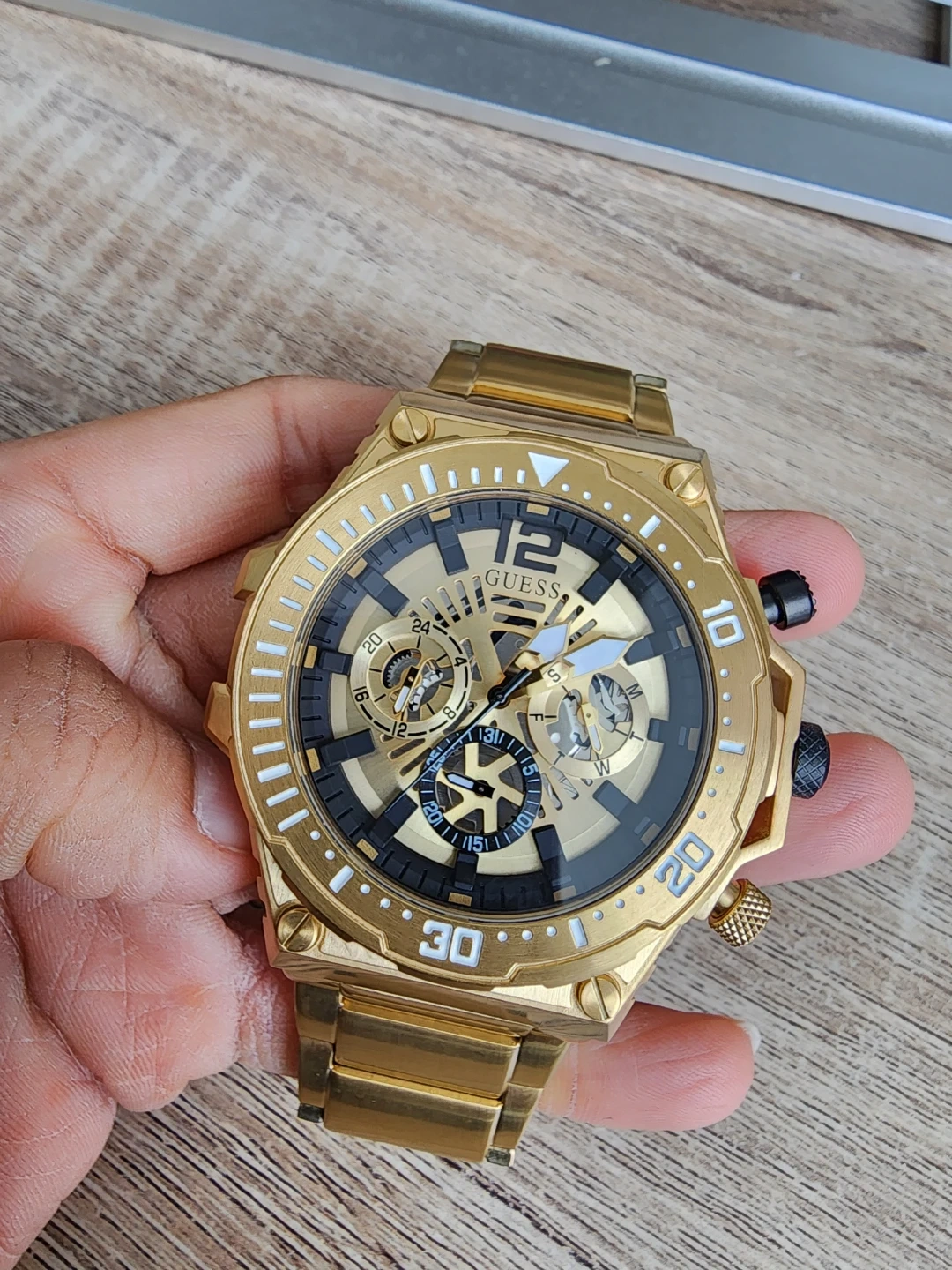 Gold-tone Guess watch with a black and gold dial. It features multiple subdials and a stainless steel band. This watch is a bold accessory for any outfit.