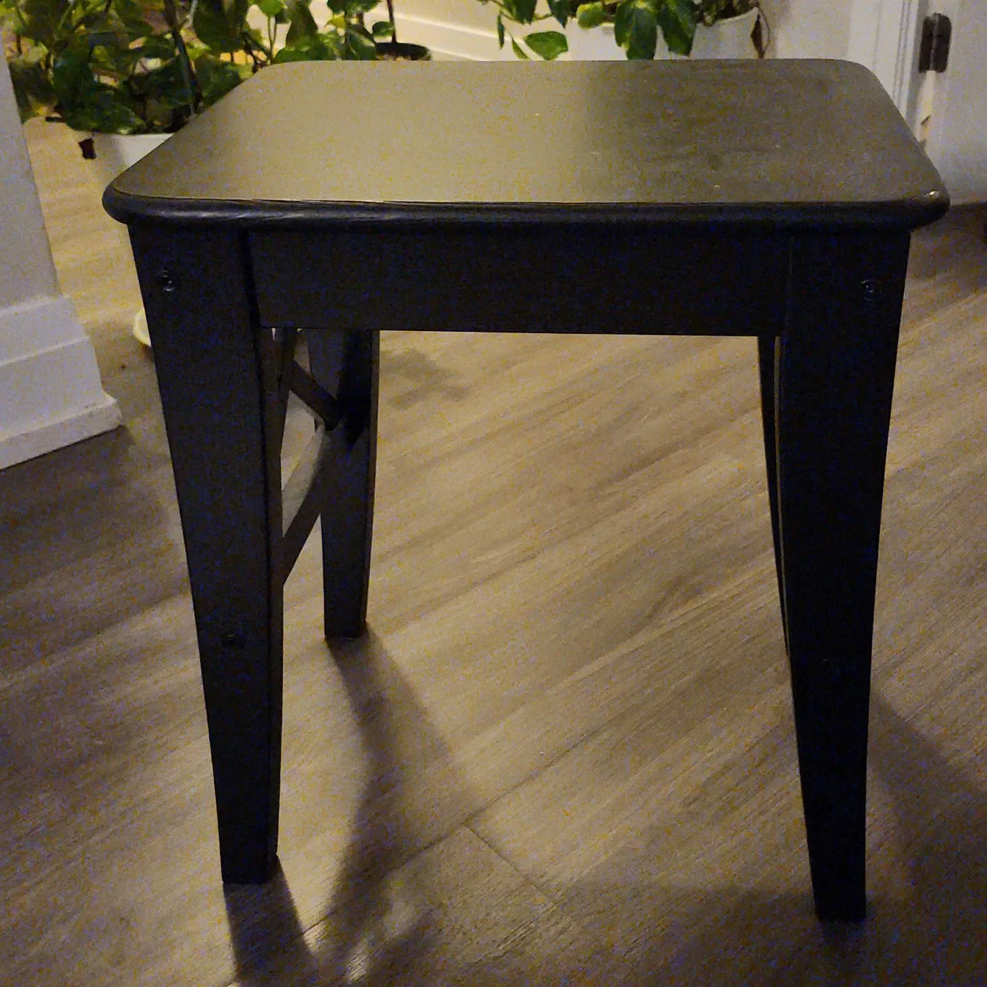 This is a dark-coloured stool. It's made of wood. The stool has a rectangular top and four tapered legs. It's a handy size for general use.