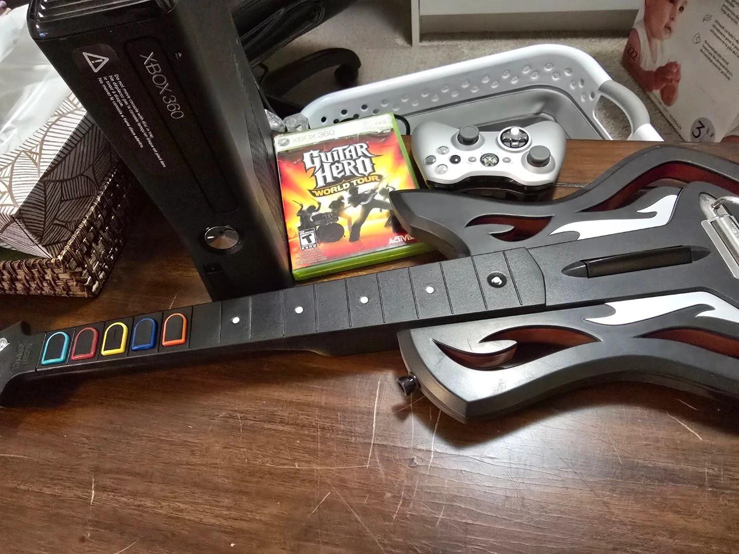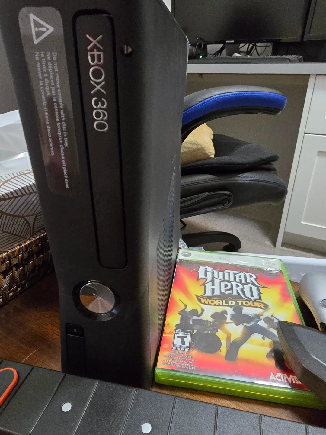 Selling an Xbox 360 console, complete with the Guitar Hero World Tour game and guitar controller. This bundle includes a wireless controller and all necessary components for setup, including hdmi cord.