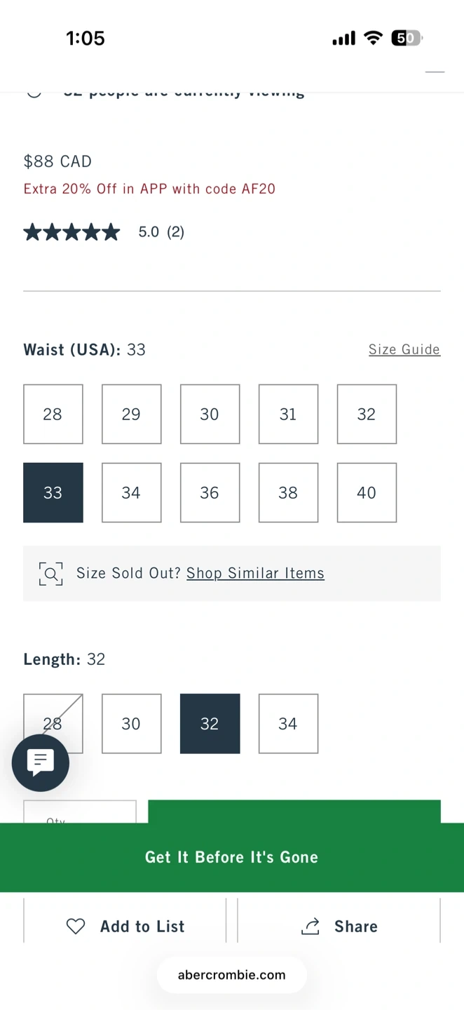Abercrombie & Fitch Athletic Loose Jean - Waist 33, Length 32