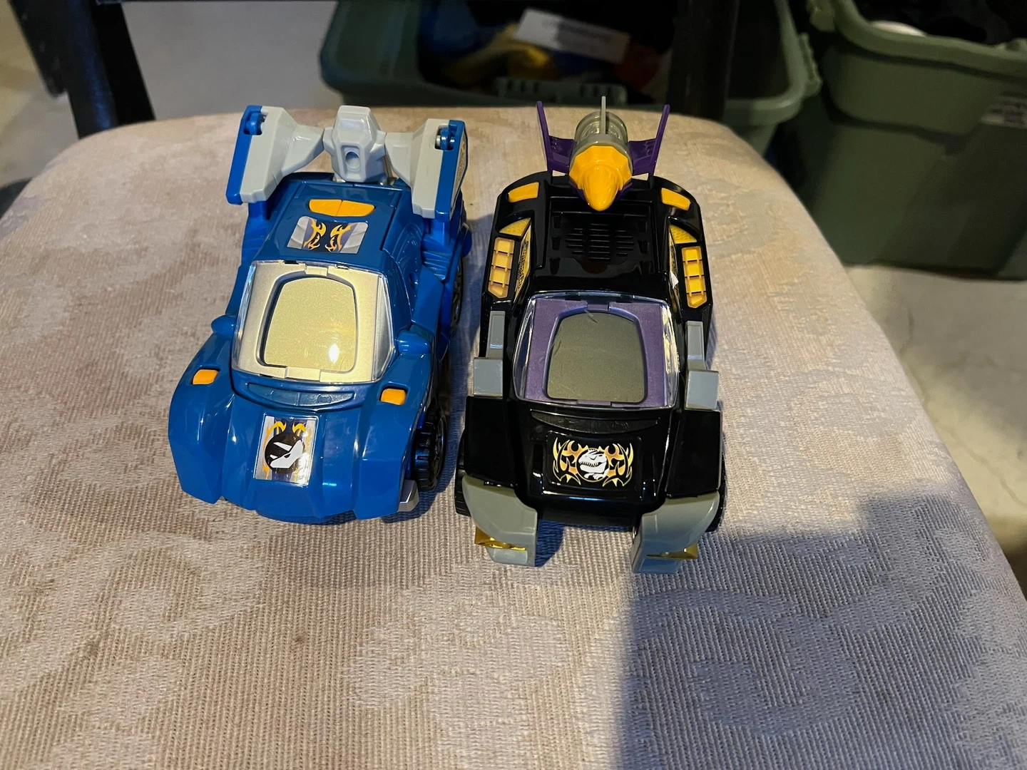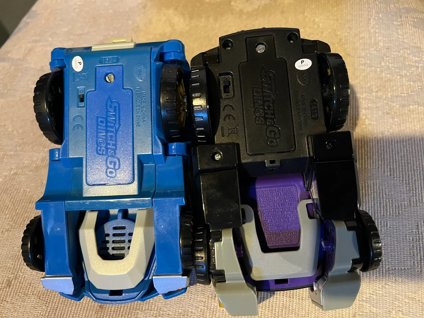 Two transforming toy cars, one blue and one black, from the Switch & Go Dinos line. These vehicles convert into dinosaur robots. Made of plastic.