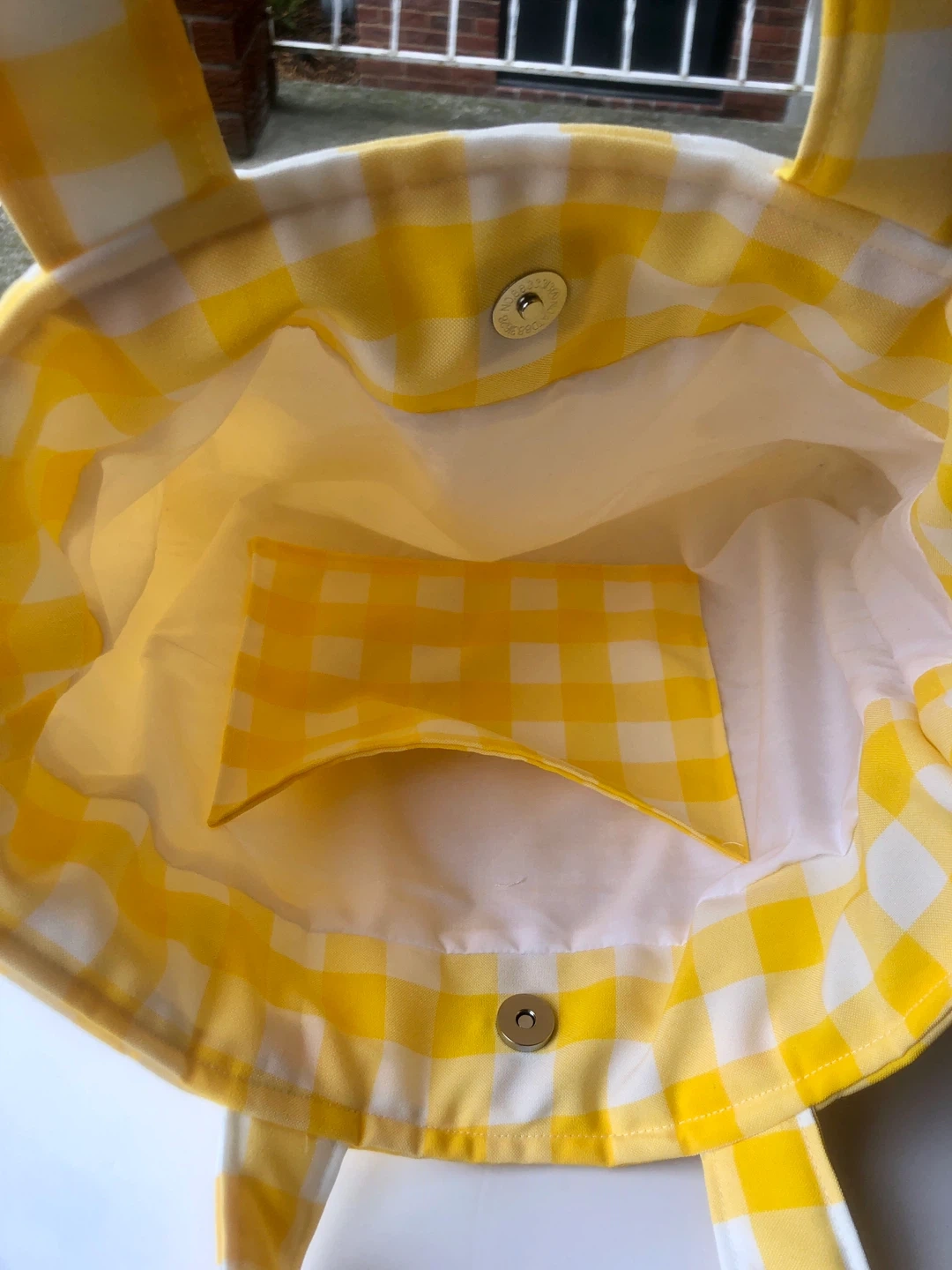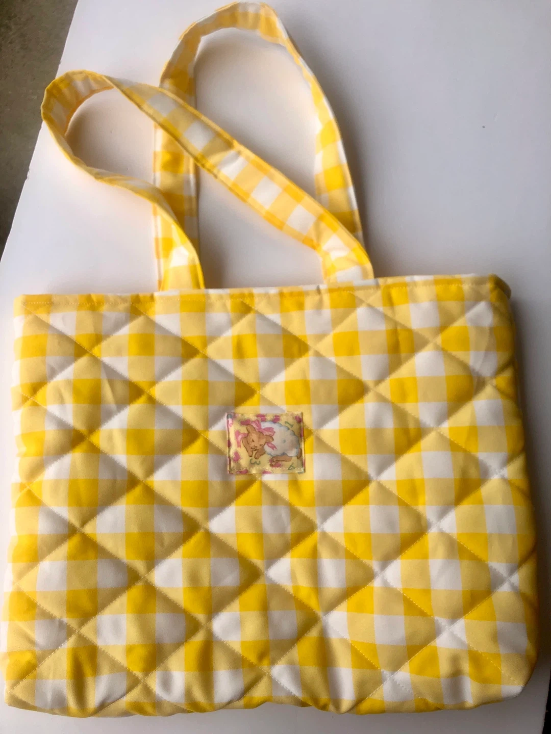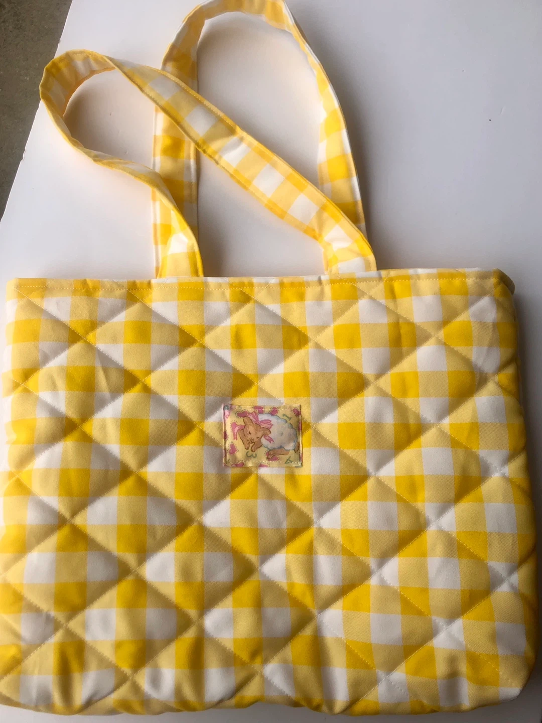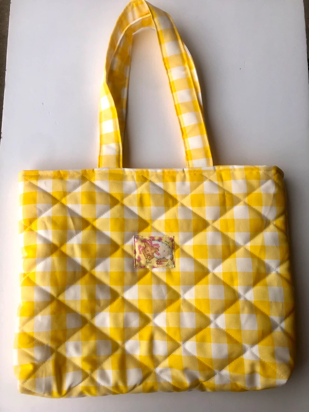 A cute quilted tote bag featuring a yellow and white gingham pattern.