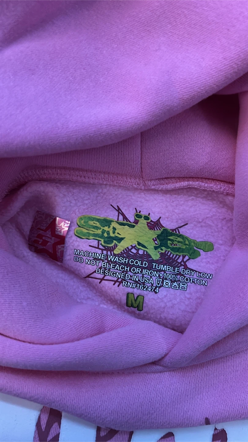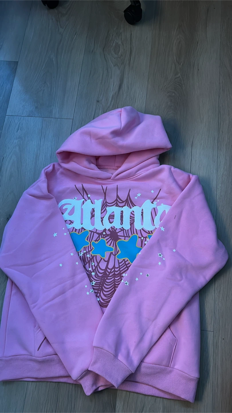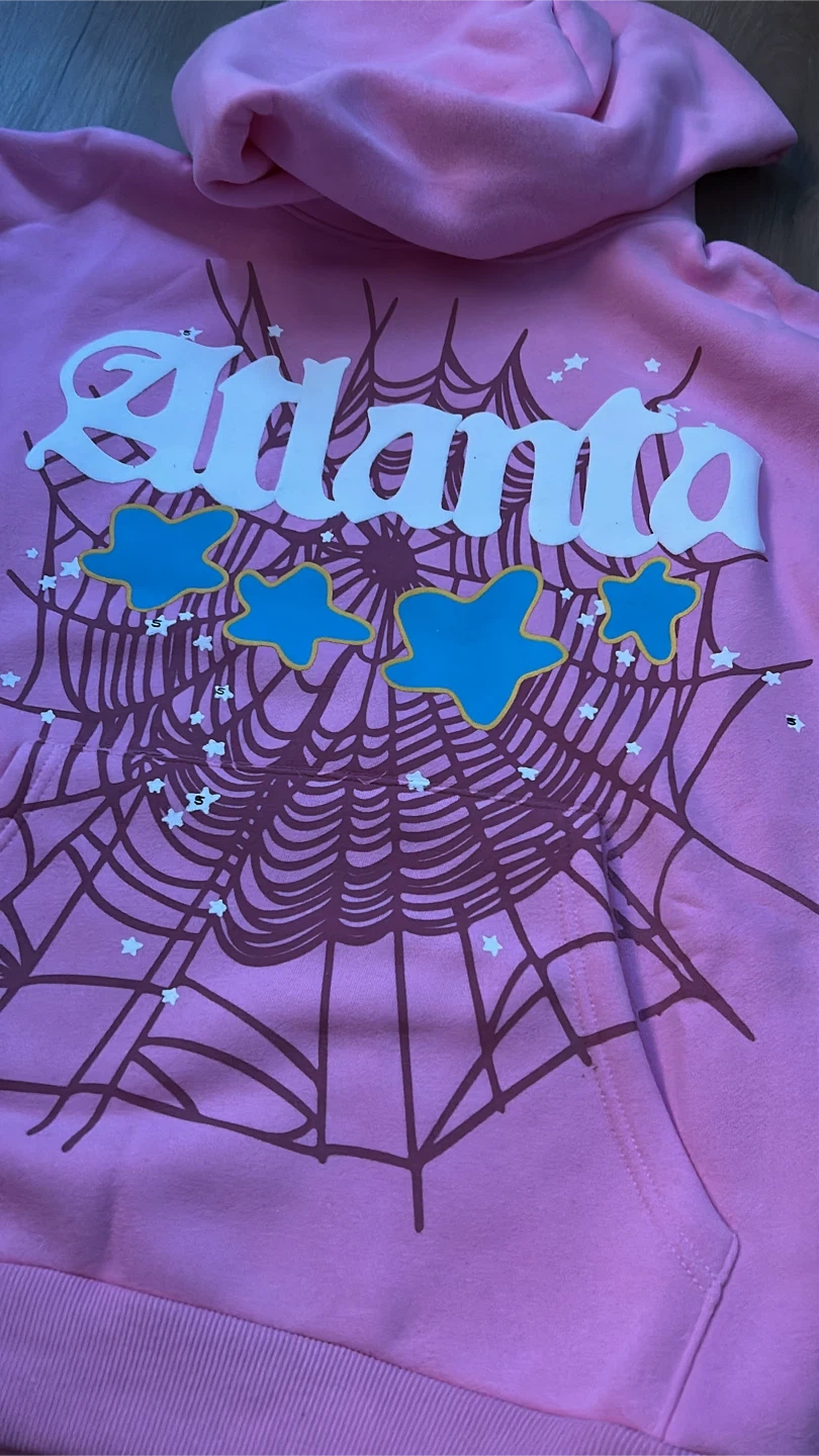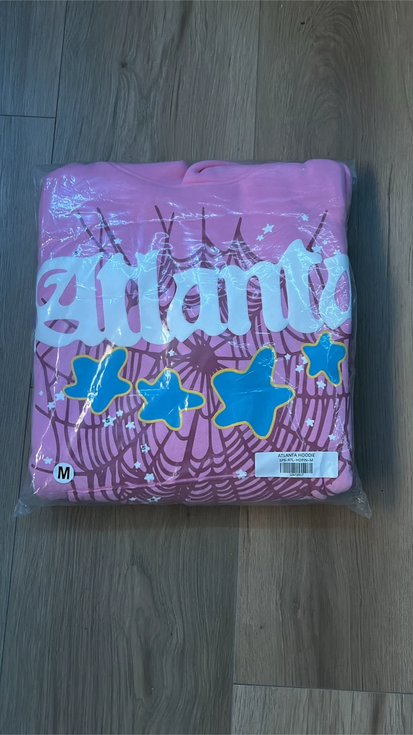 This is a pink hoodie with a spider web and "Atlanta" graphic on the front. It's 100% cotton and designed in the USA. The size is medium.