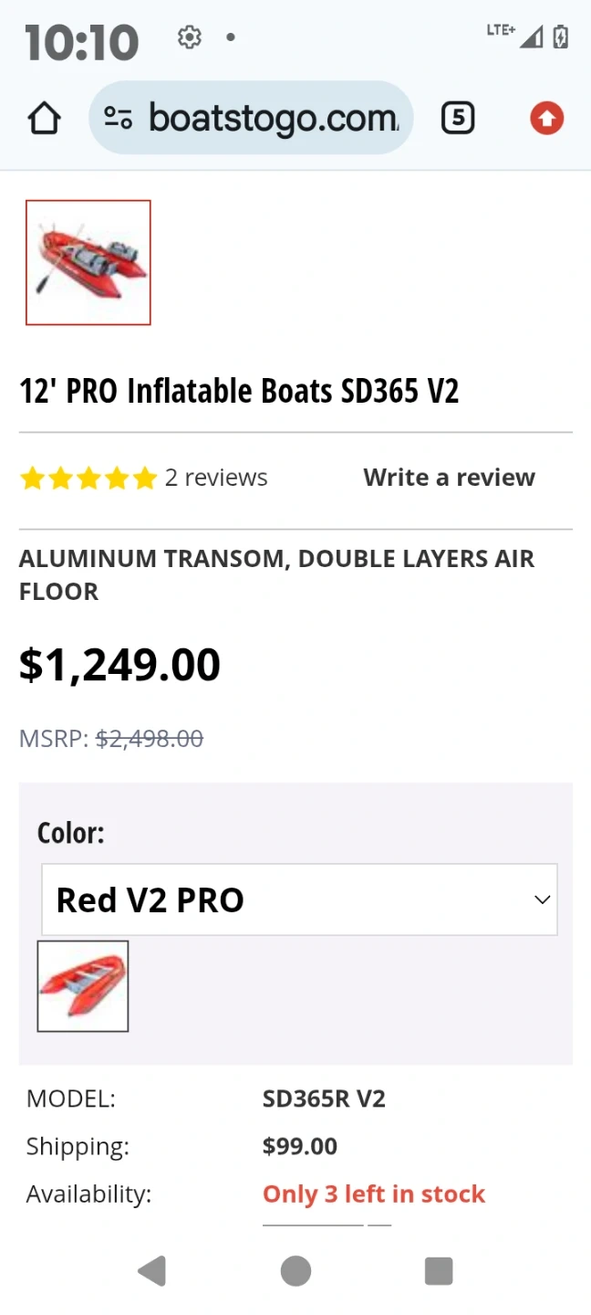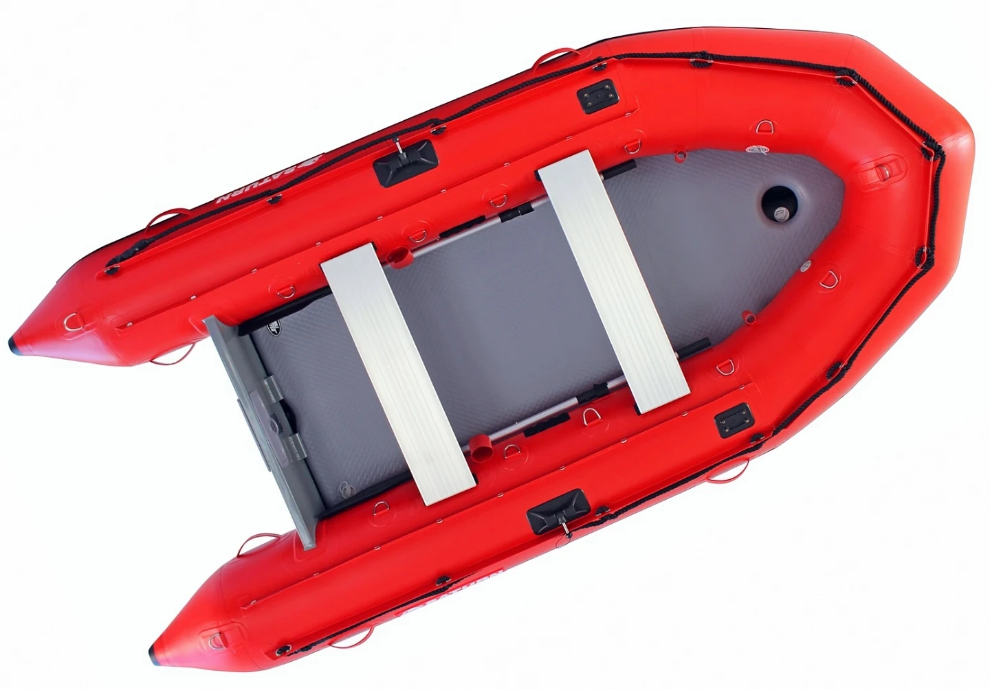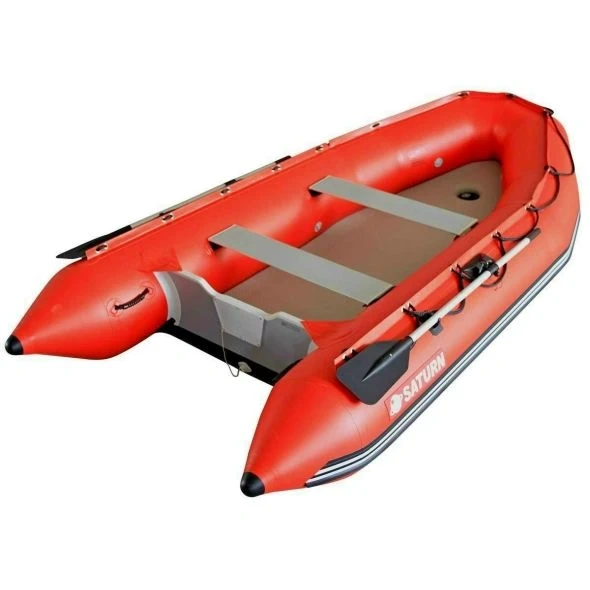 Red Saturn inflatable boat. It has built-in transom wheels for easy transport. It's made of durable material. capacity of 5 but comfortably fits 4.
