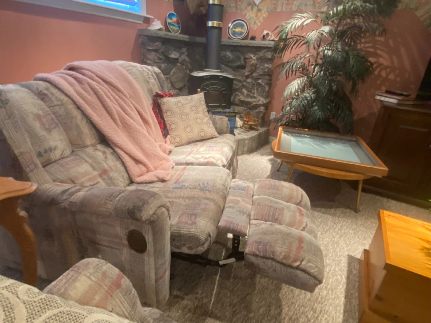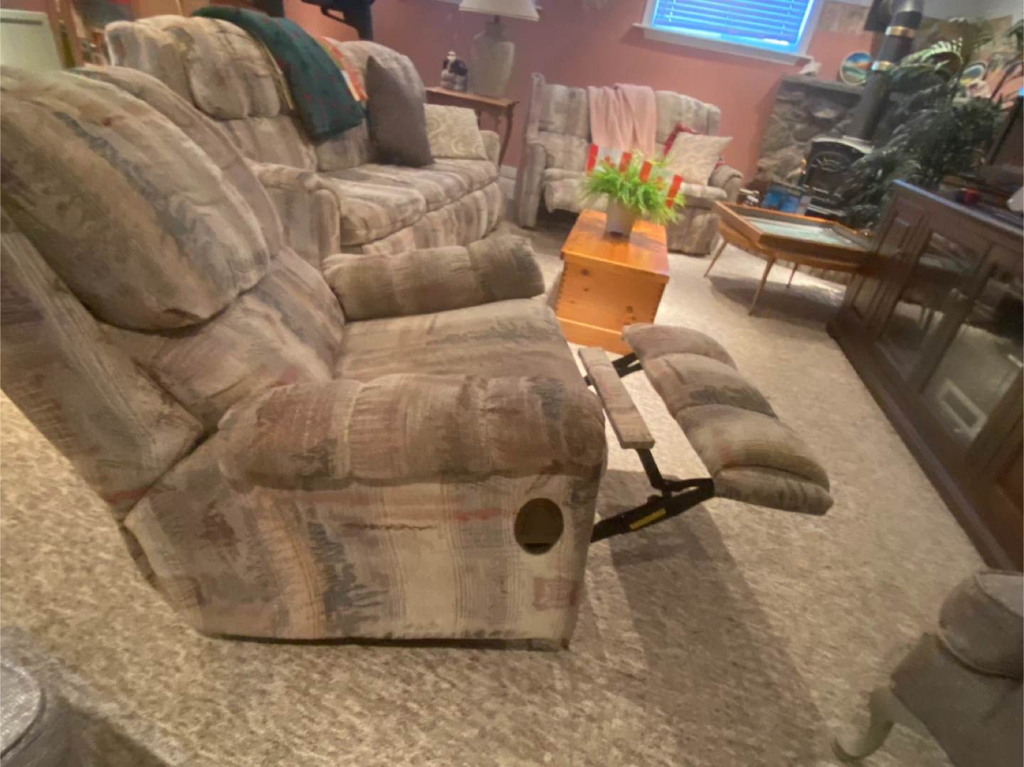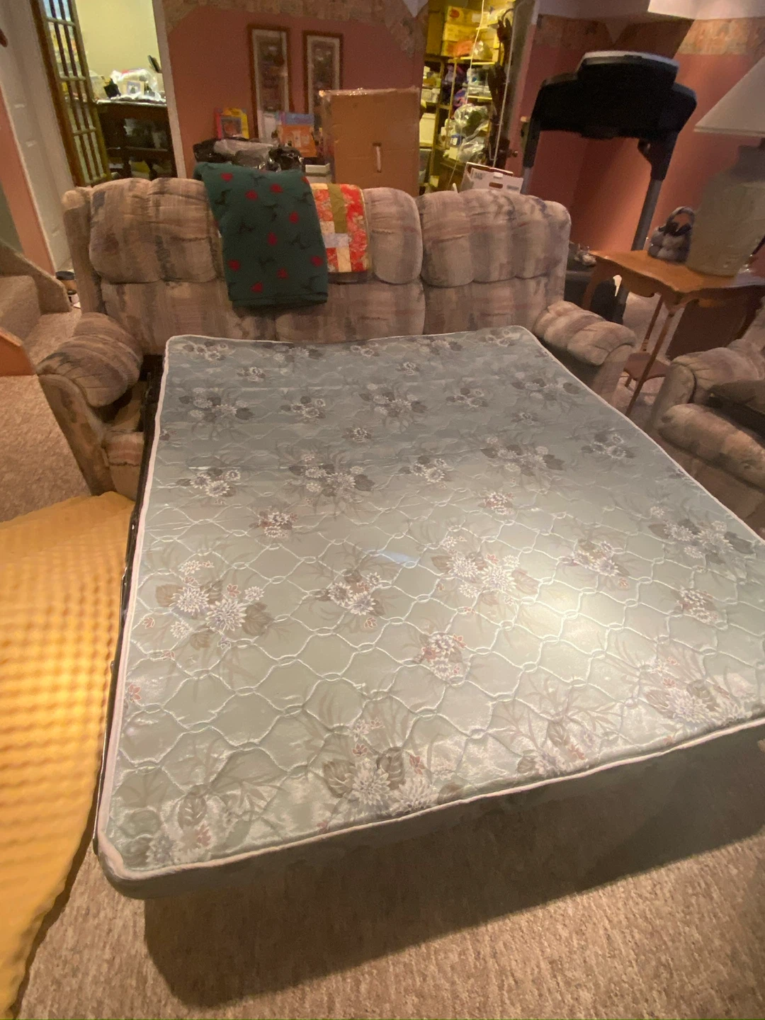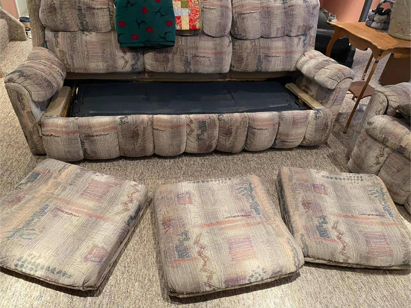 Living room set-queen sofa bed / pull-out couch, dual recliner loveseat,rocker recliner chair Queen sofa bed / Couch: 81 x 33“ Dual reclining love seat : 55 x 33“ Recliner rocker: 36 wide X 33” deep Solid construction Durable material. Well cared for. Mattress always covered with foam Smoke free home. Originally bought from Park’s furniture in Hamilton. Was used in our basement family room but we have moved up to our garage so easy to pick up now. We did the hard work 😩 Pick up in Lynden from smoke-free home. (We are part of city of Hamilton and are between Dundas and Brantford)