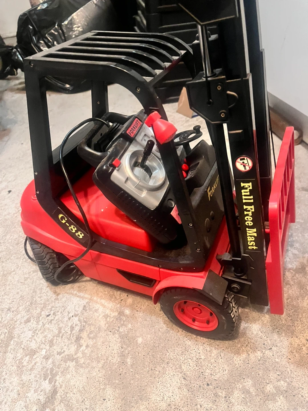 Selling a Golden Bright RC Forklift in red! It comes with a remote control. It looks like it's in good condition and ready for some fun