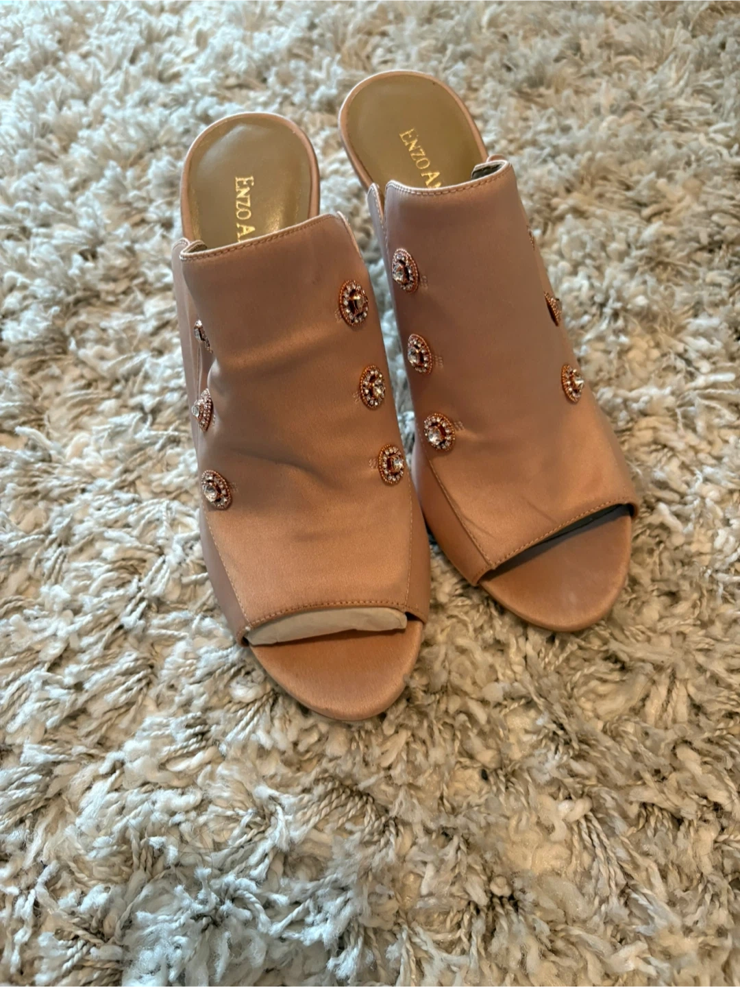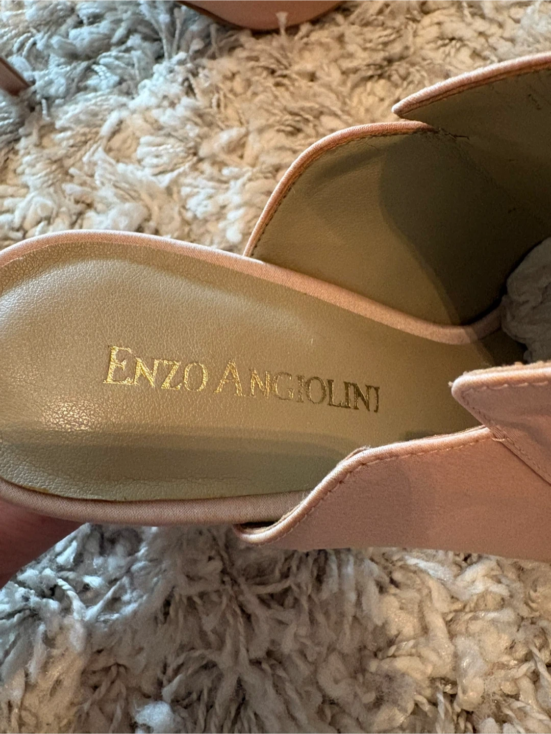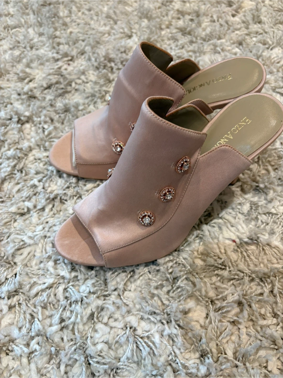 Enzo Angiolini heeled mules in a lovely pale pink satin. These shoes feature pretty embellishments on the front strap. Size is 6.