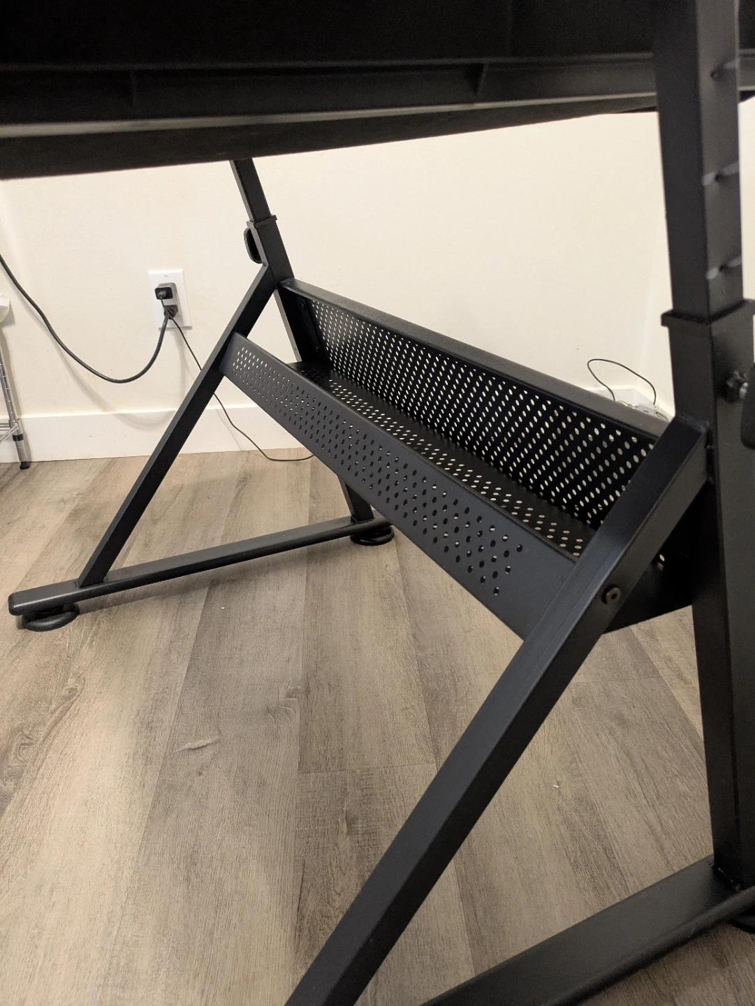 Still in great shape, everything works properly. Adjustable height. Minor paint marks on desktop. Includes 2 fabric drawers (stuff in drawers not included). I still have the pull out leaf on the side as well, I just removed it to save space.
