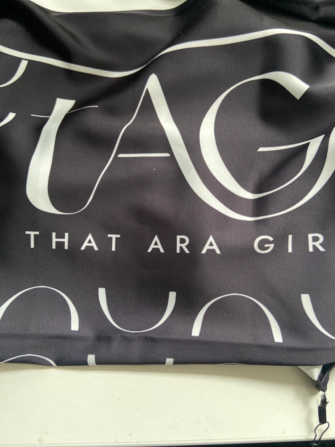 This is a TAG That Ara Girl scarfIt's black with white lettering and graphics. The scarf is made of a durable material.