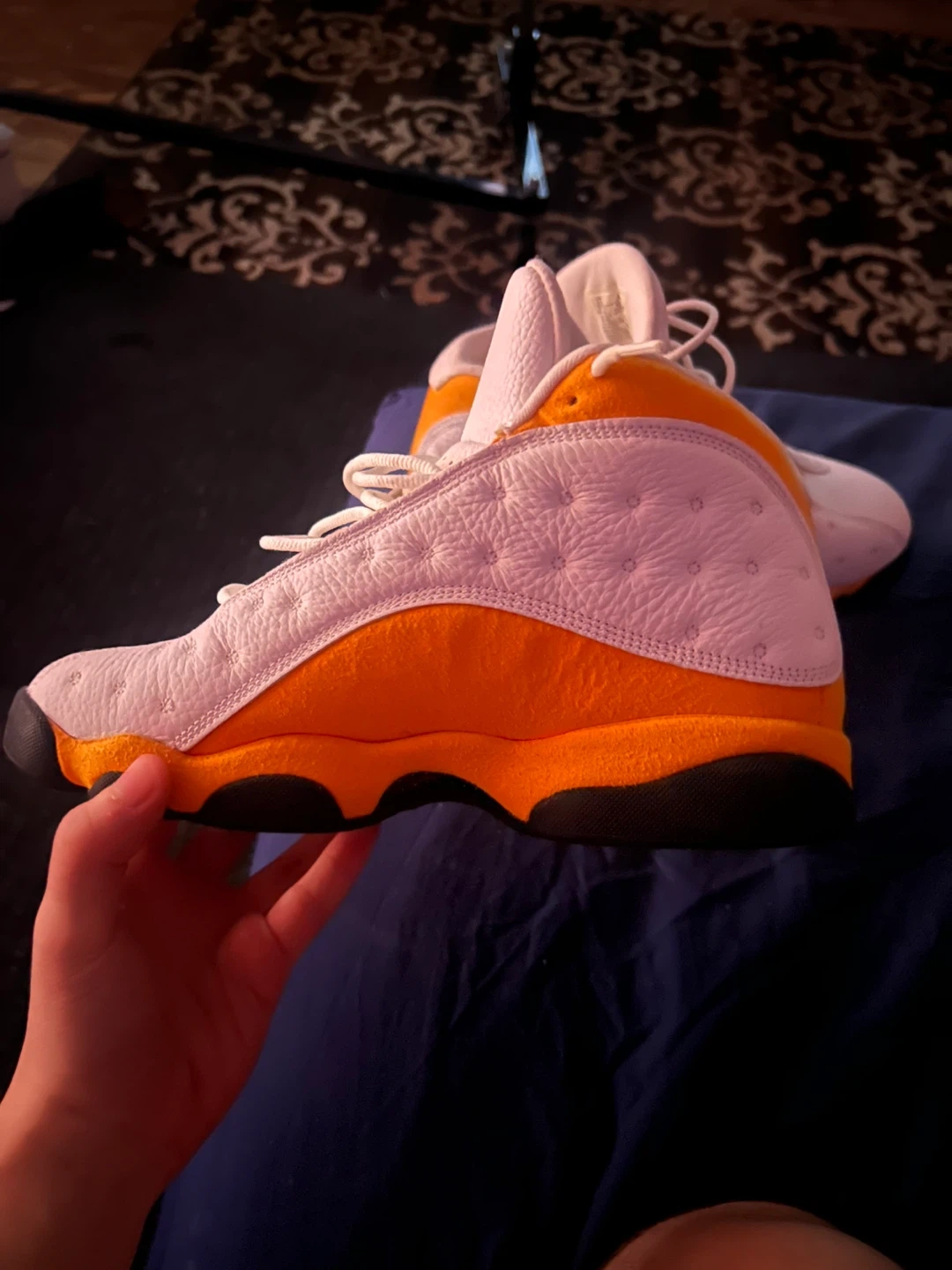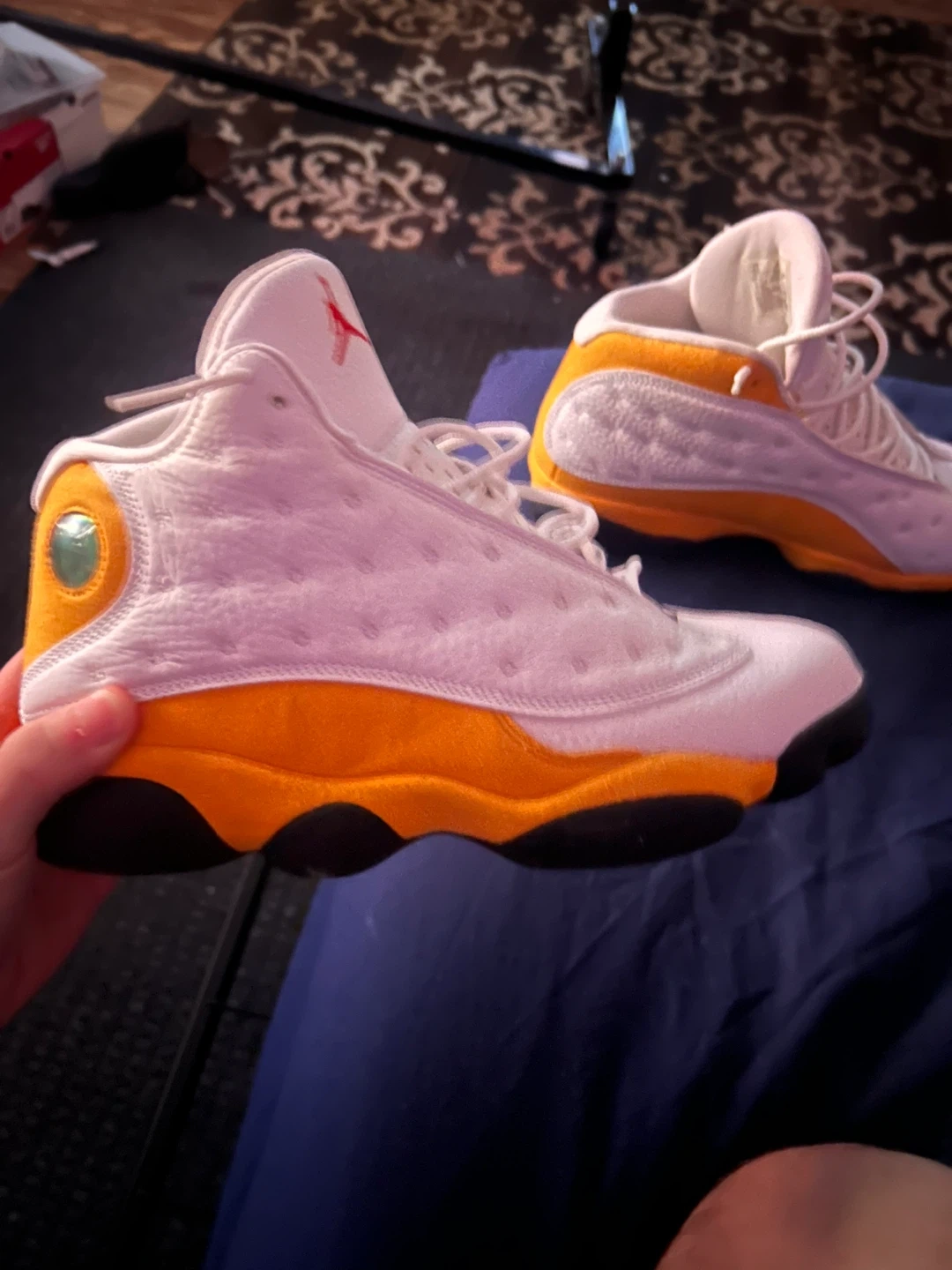 White leather Air Jordan 13 Retro sneakers with yellow accents. These athletic shoes feature a classic lace-up closure and a rubber sole.