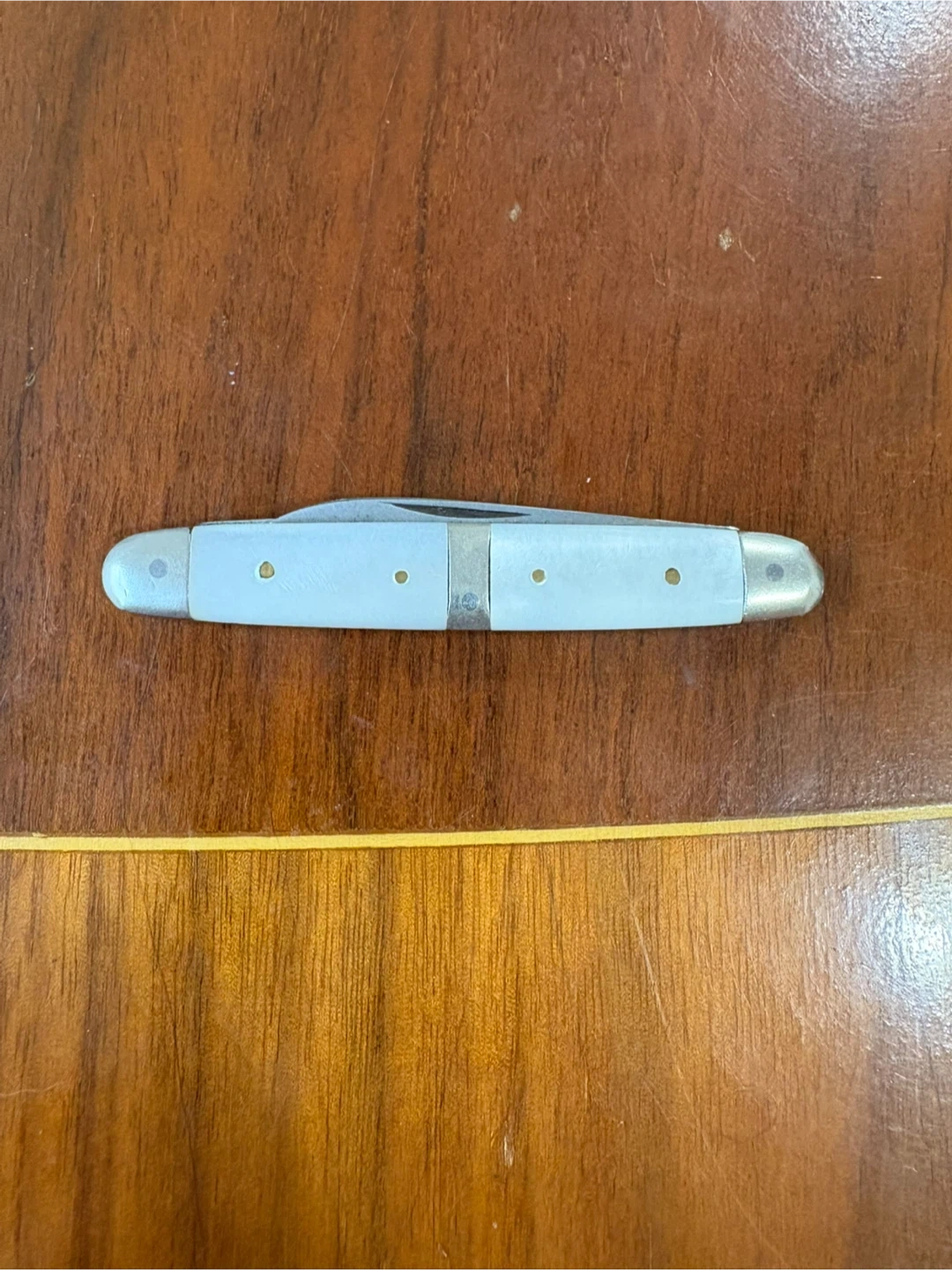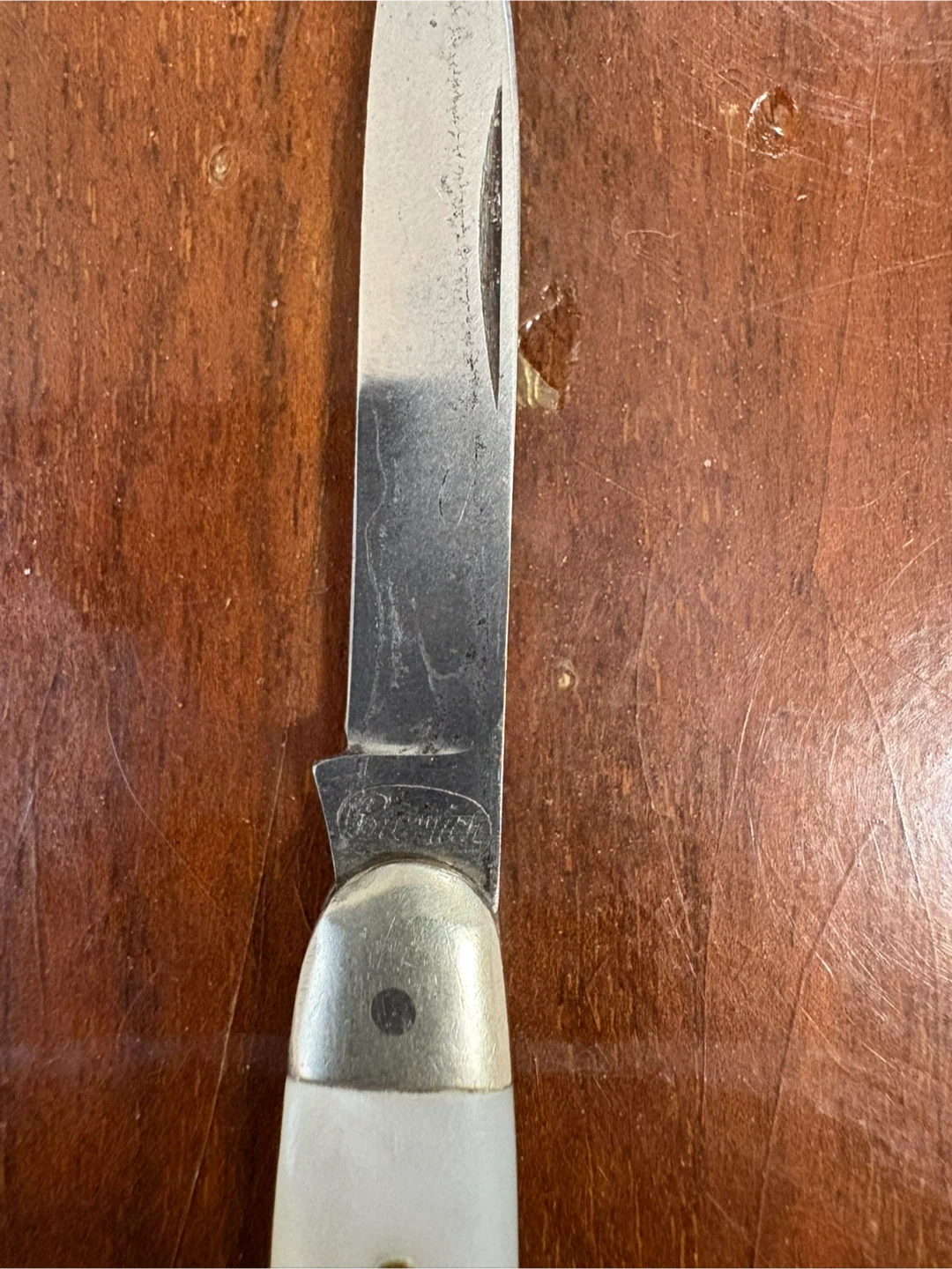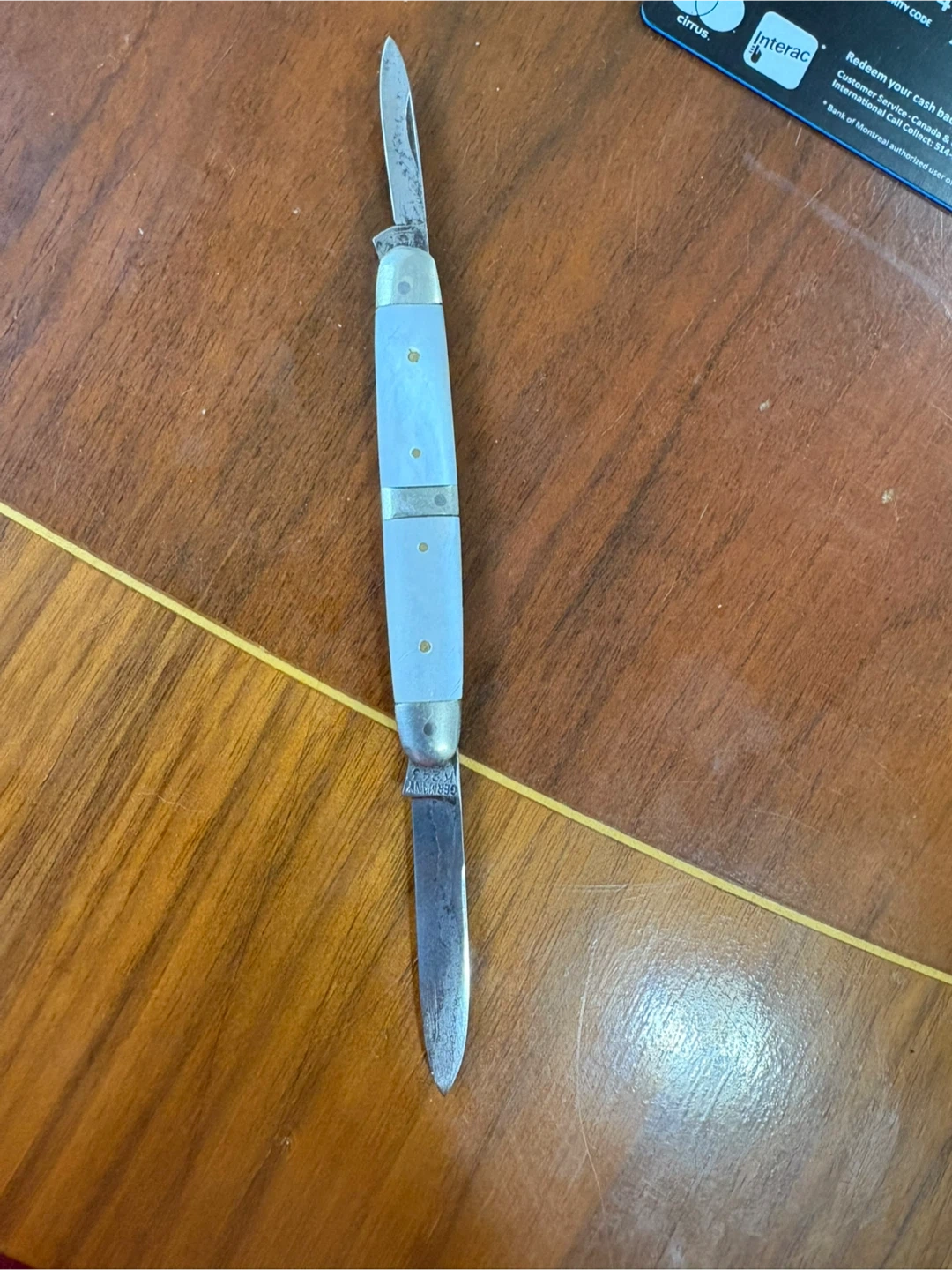 A classic folding pocket knife with two blades. The handle is mother of pearl. It's stamped 'Germany' K243. This knife is a great utility tool for everyday carry or collecting.