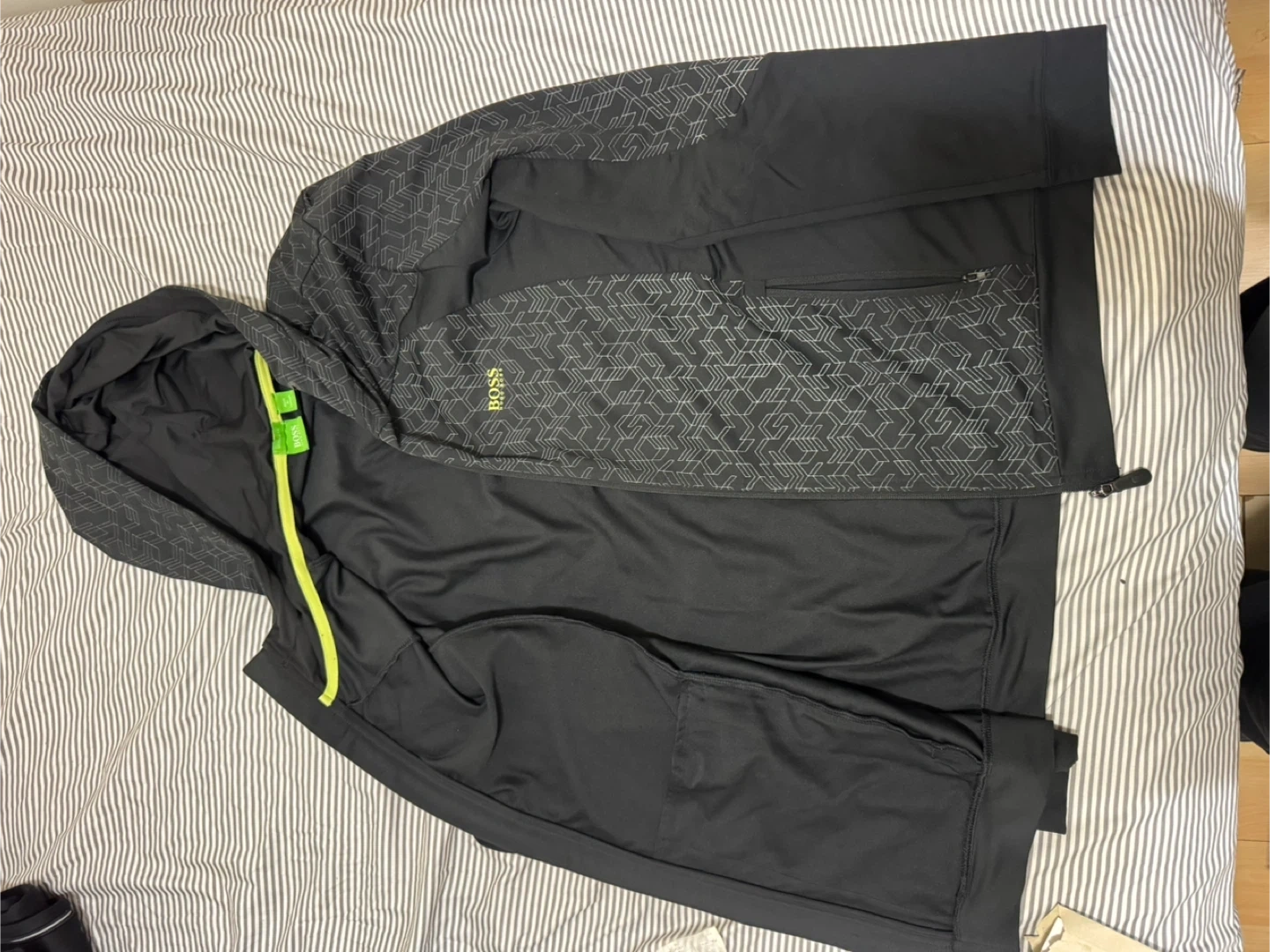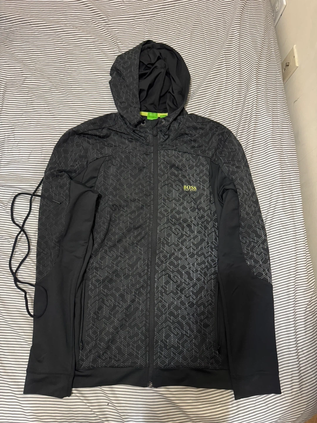 Hugo Boss black hoodie in size medium. It's in great condition and ready for a new owner! The hoodie features a unique geometric pattern on the hood and upper chest, adding a touch of style. Perfect for layering or wearing on its own. Free delivery within Markham and Scarborough.