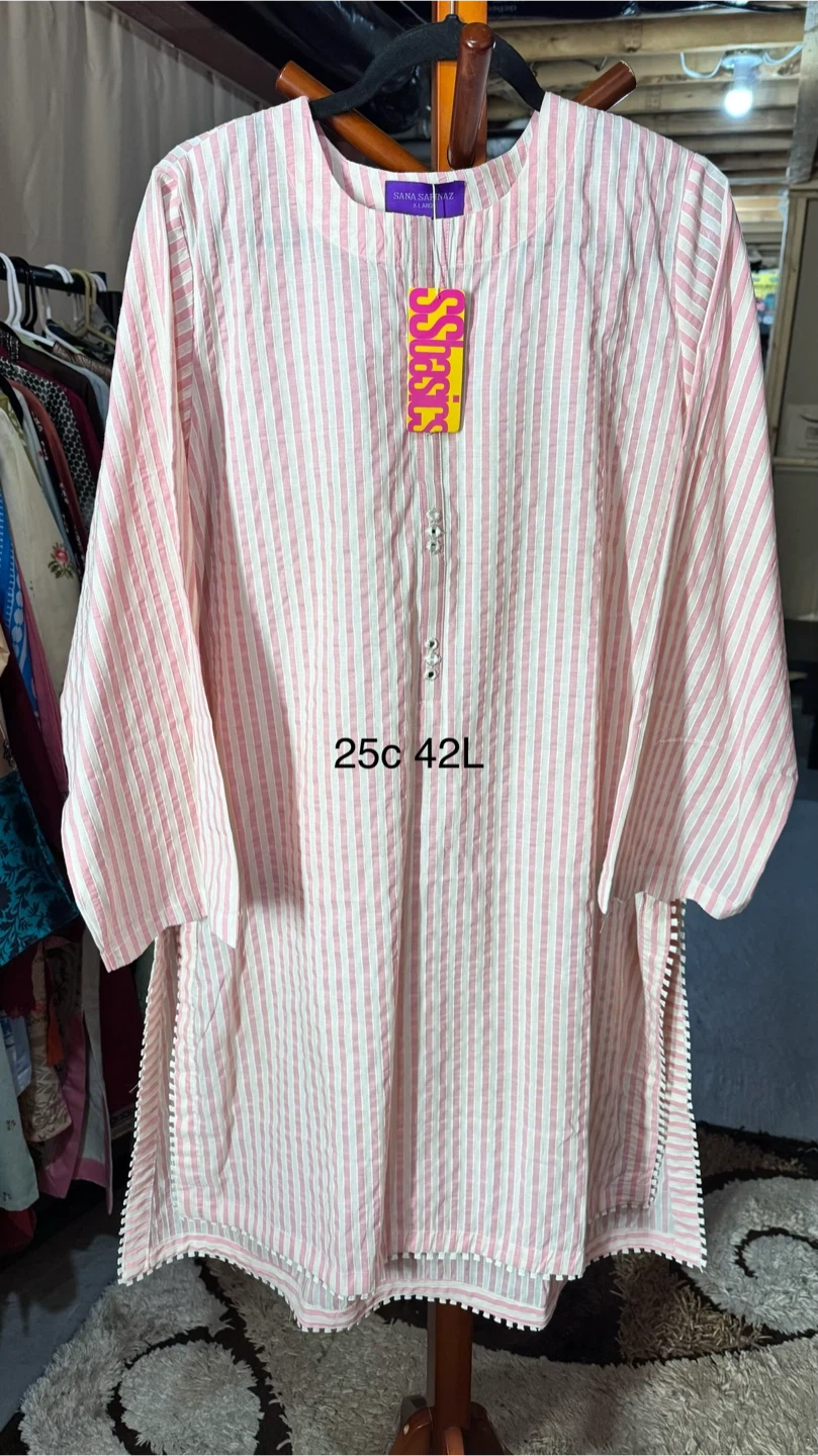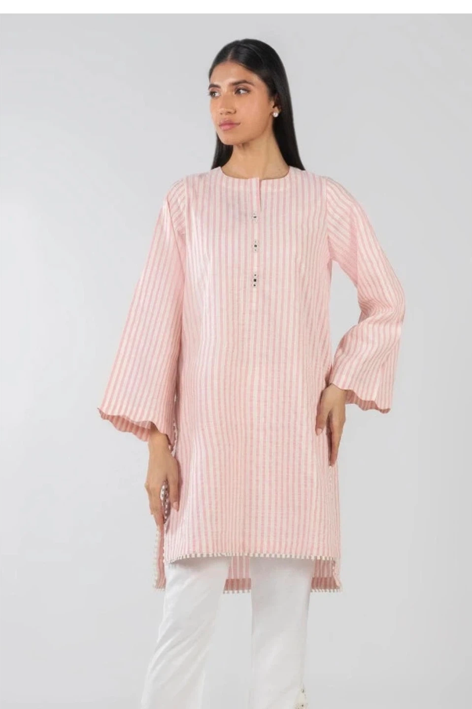 Selling a lovely kurti in a pink and white striped pattern. It's a size 42L and features a unique flared sleeve design. Perfect for adding a touch of elegance to your wardrobe!