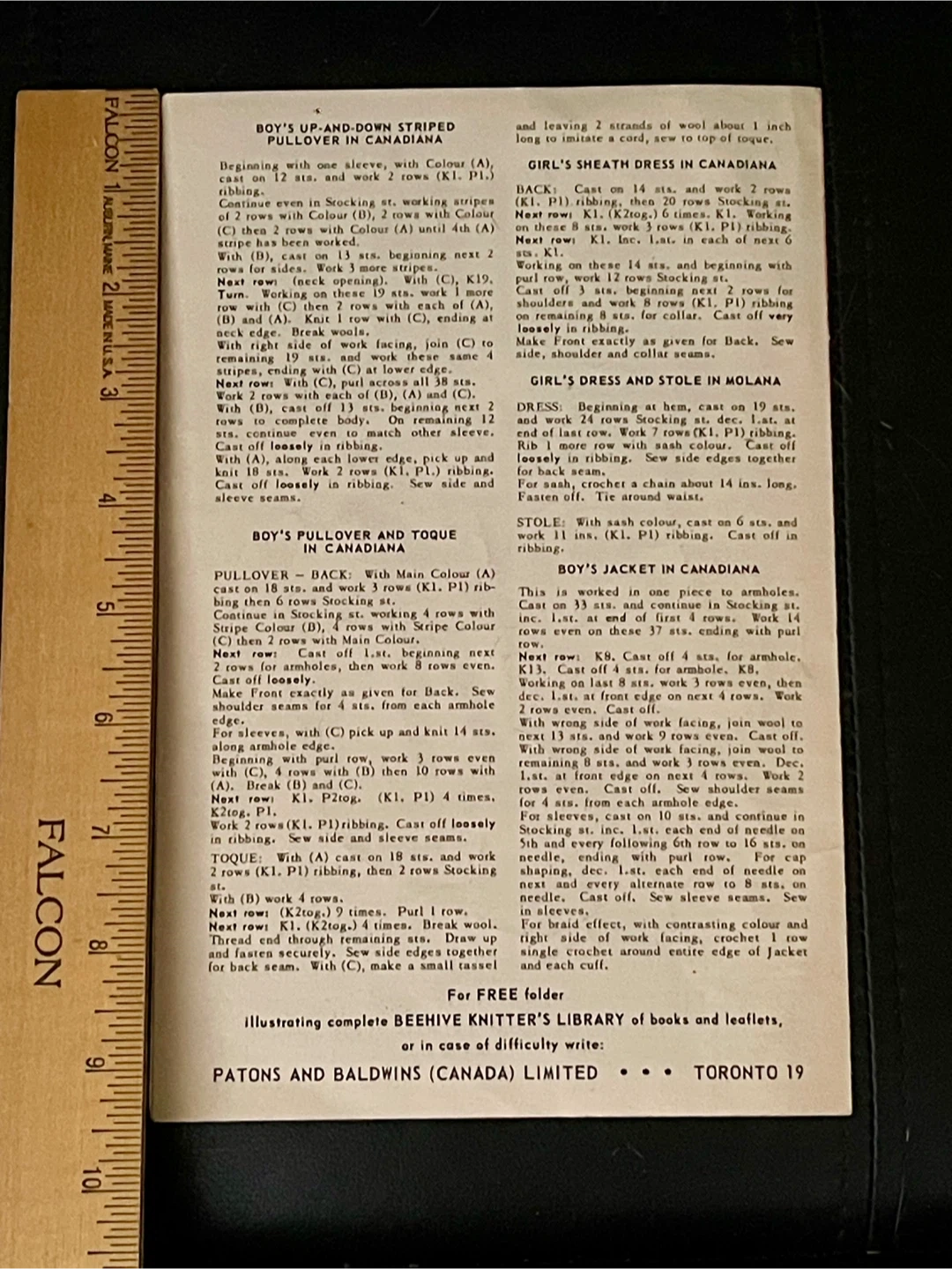 This vintage knitting pattern pamphlet by Beehive features handknits for Barbie and Ken type dolls. It includes patterns for outfits in Molana and Canadiana styles. Four pages as shown. Pages are clean except for small piece of blue tape on front cover bottom.