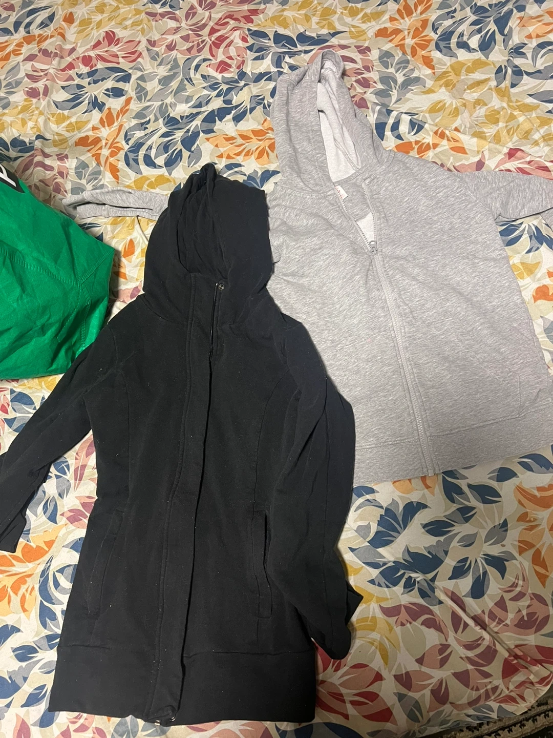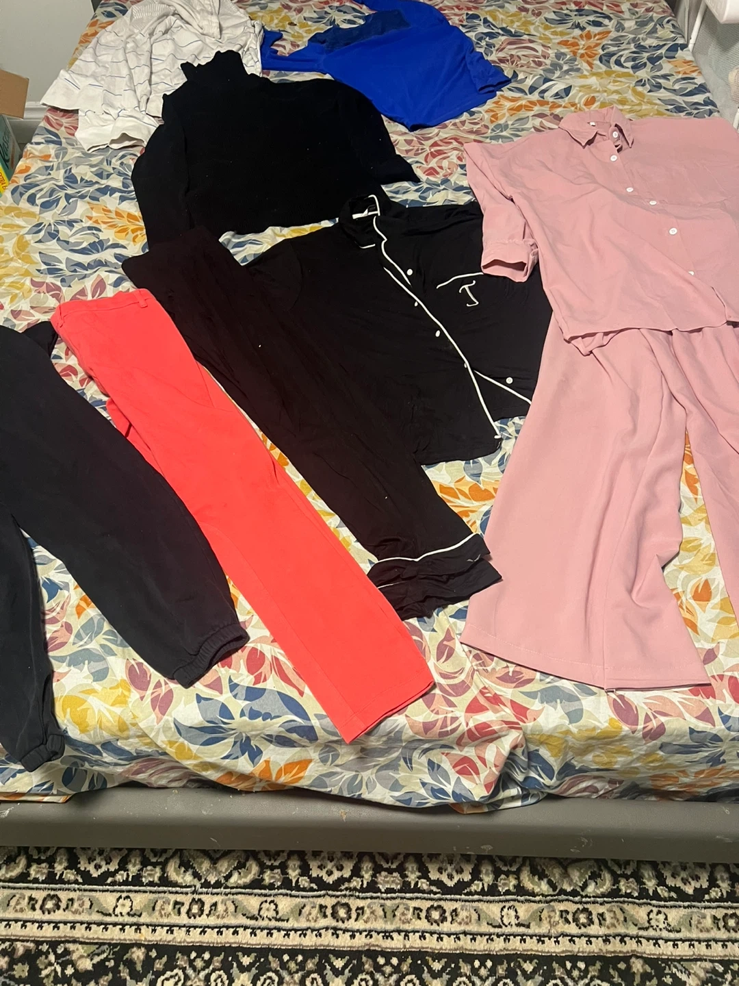 Includes a black zip-up hoodie and a grey zip-up hoodie. Also a pink pajama set and a black pajama set. Additionally, a pair of coral pants and black pants are included. Great for loungewear or casual wear!