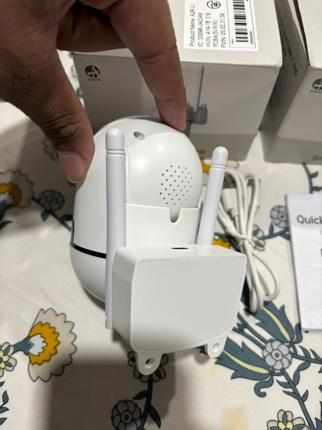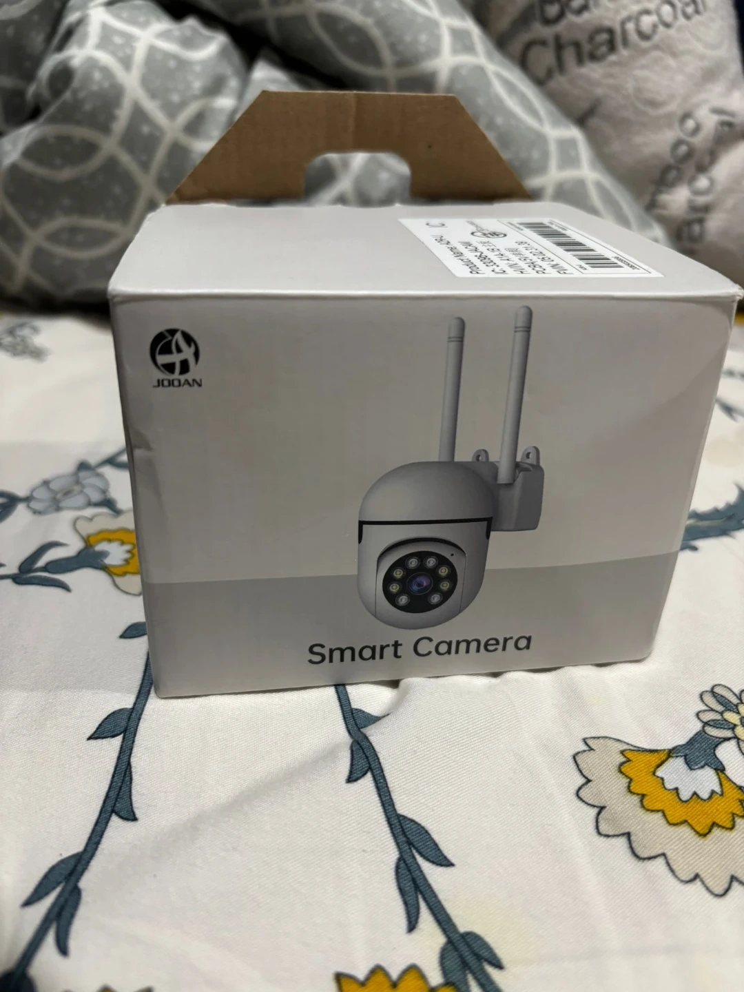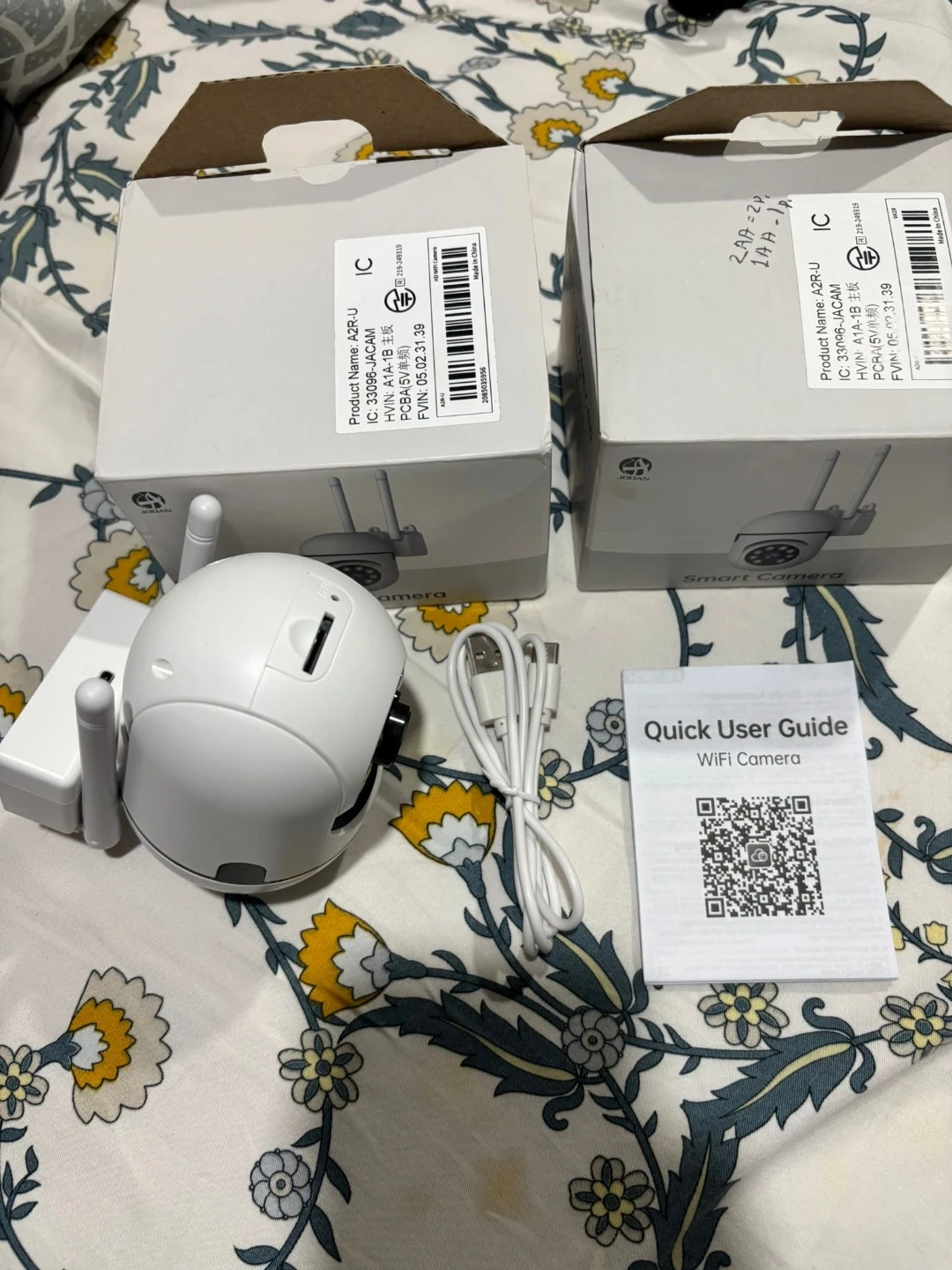This is a JOOAN Smart Camera A2R-U WiFi. It's white and includes the camera, USB cable, and a quick user guide. The camera has an adjustable mount. 2pcs brand new