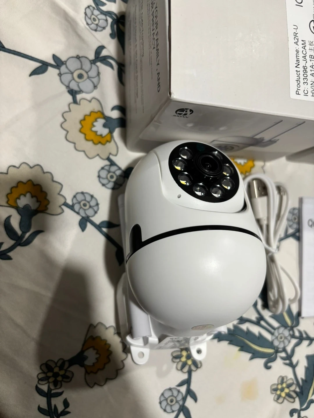 This is a JOOAN Smart Camera A2R-U WiFi. It's white and includes the camera, USB cable, and a quick user guide. The camera has an adjustable mount. 2pcs brand new