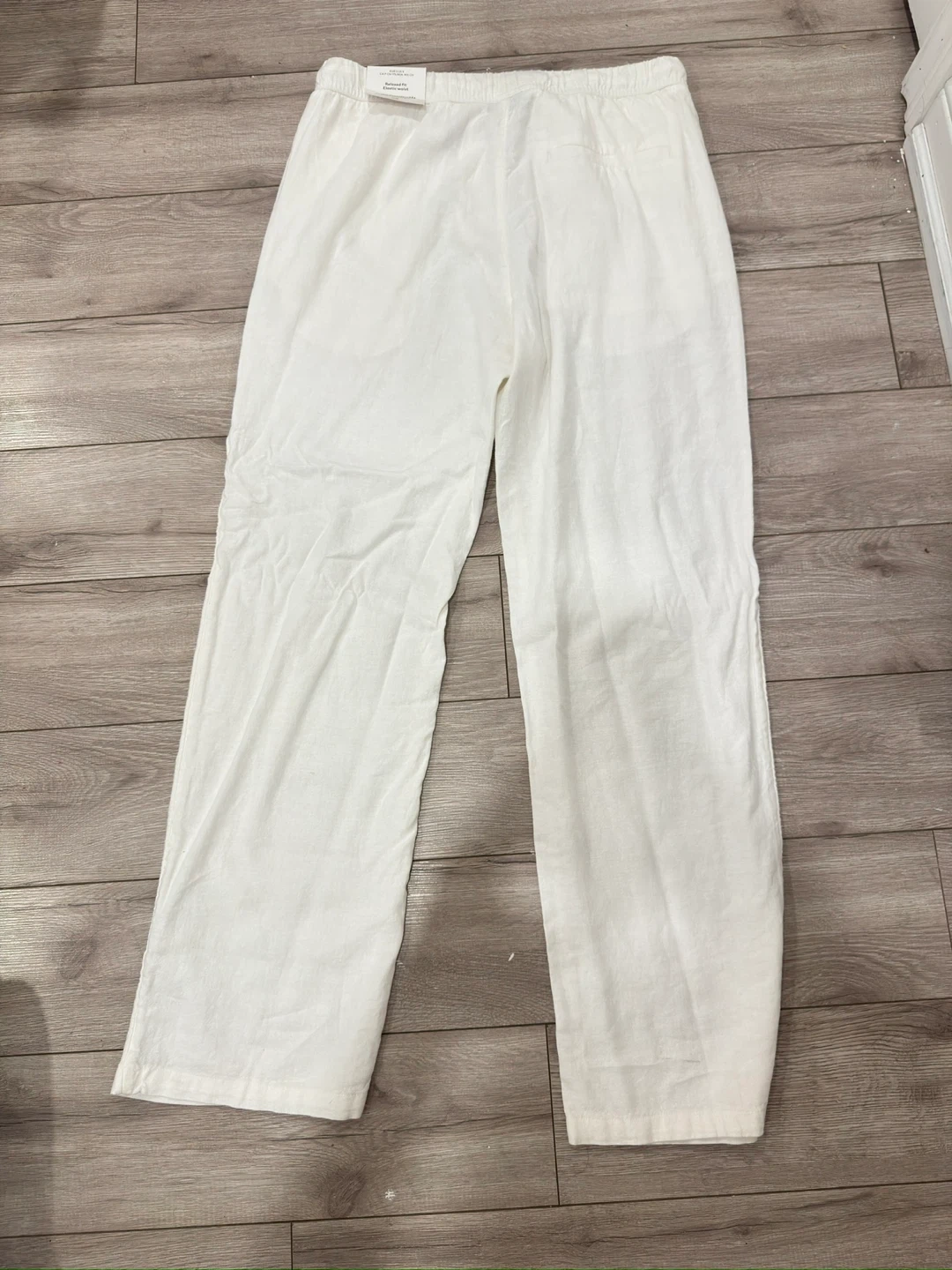 Selling a pair of H&M relaxed fit pants in size small. They're white and have an elastic waist for extra comfort. Perfect for a casual day out!