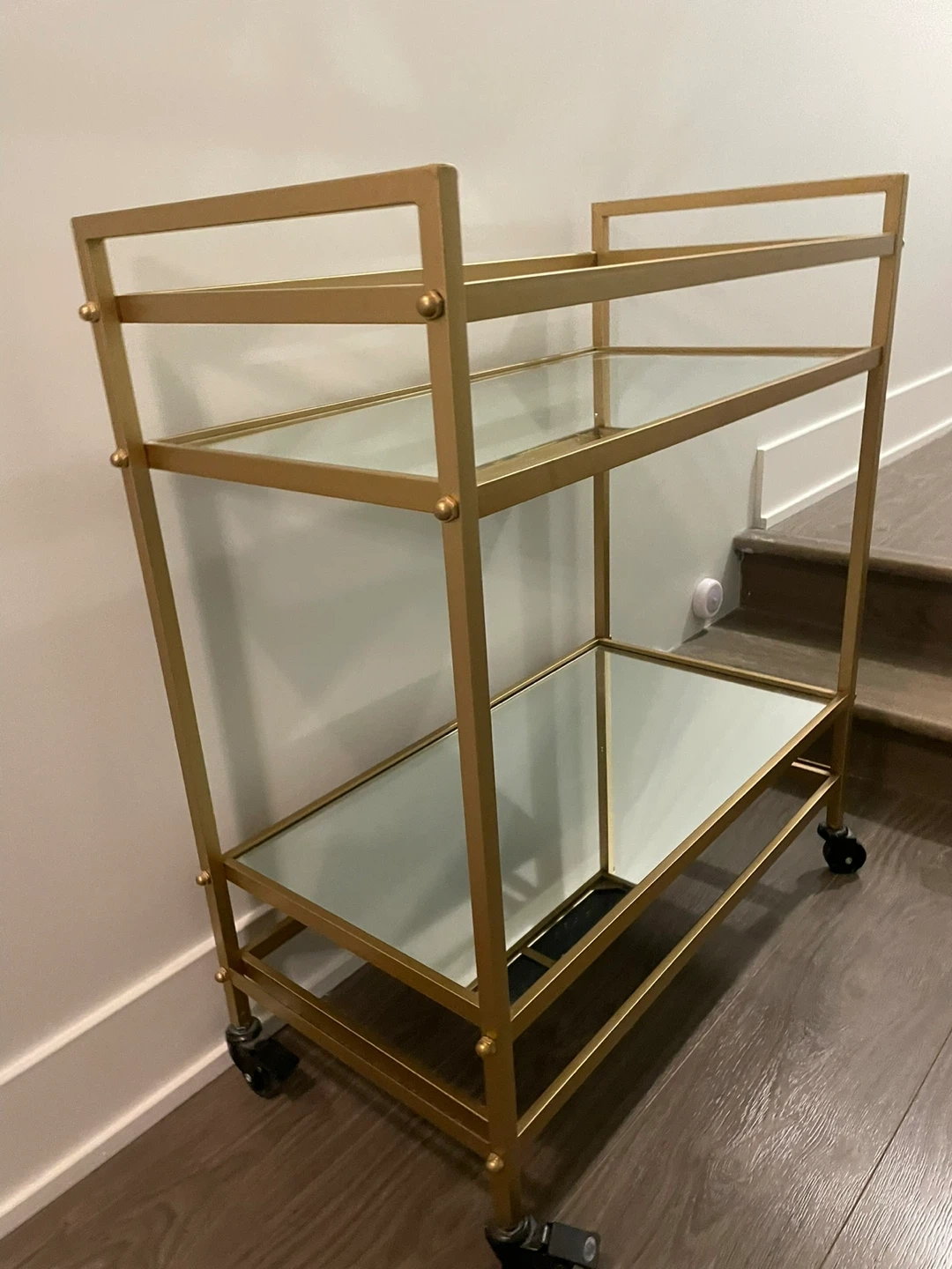 Stylish gold metal bar cart featuring mirrored shelves. It has two tiers for storage and display. Rolls on caster wheels for easy movement.
