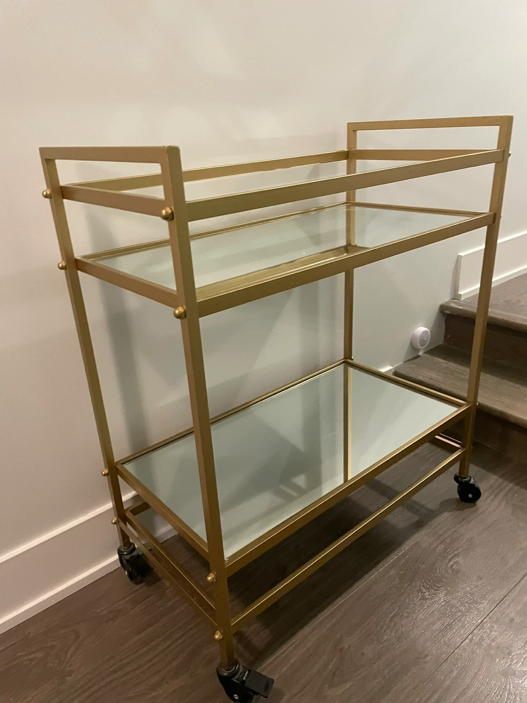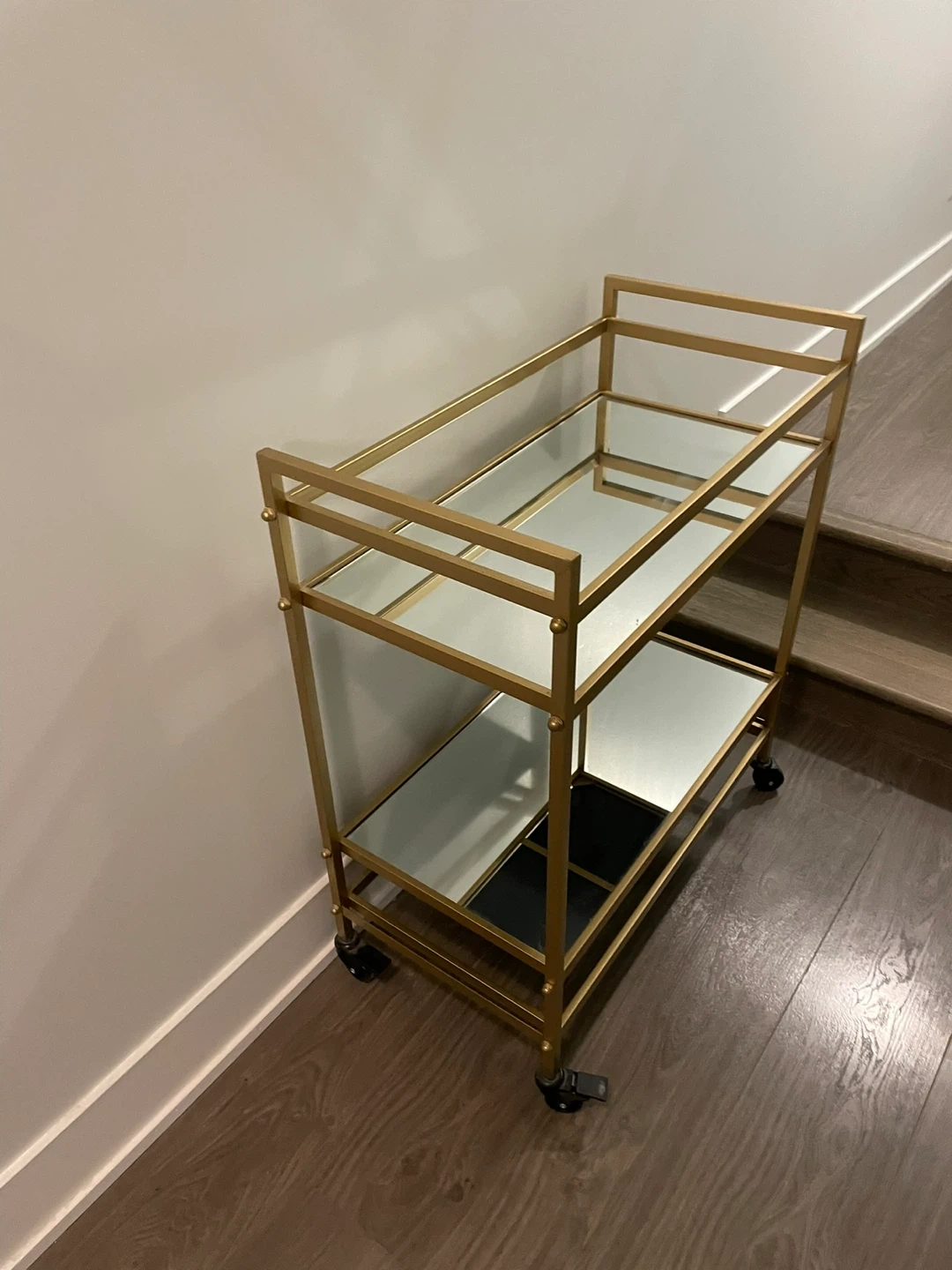 Stylish gold metal bar cart featuring mirrored shelves. It has two tiers for storage and display. Rolls on caster wheels for easy movement.