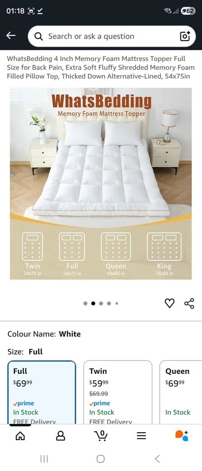 Full / Double Size (54 x 75 in). Thick pillow-top style with shredded memory foam fill. Brown piping detail and elastic corner straps to keep it in place. Open box but never used. In excellent condition. Retails on Amazon for ~$80. My price: $40. Great for adding comfort to a firm mattress, guest rooms, student housing, or basement setups. Cash only. Pick up in Mississauga near Winston Churchill & Britannia.