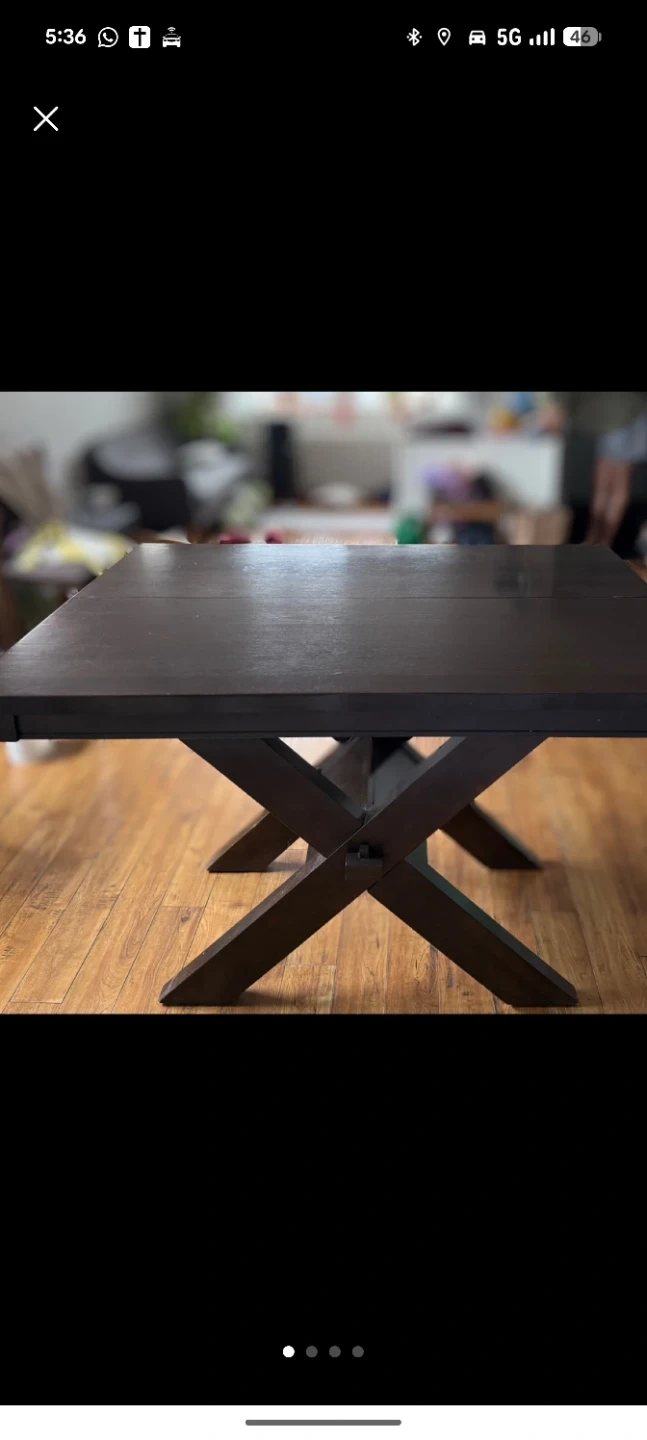 A spacious dark wood dining table featuring a unique X-base leg design. It's constructed from wood with a rich, dark finish. This table's sturdy build makes it suitable for everyday meals or entertaining guests.