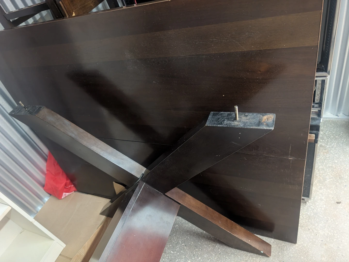 A spacious dark wood dining table featuring a unique X-base leg design. It's constructed from wood with a rich, dark finish. This table's sturdy build makes it suitable for everyday meals or entertaining guests.