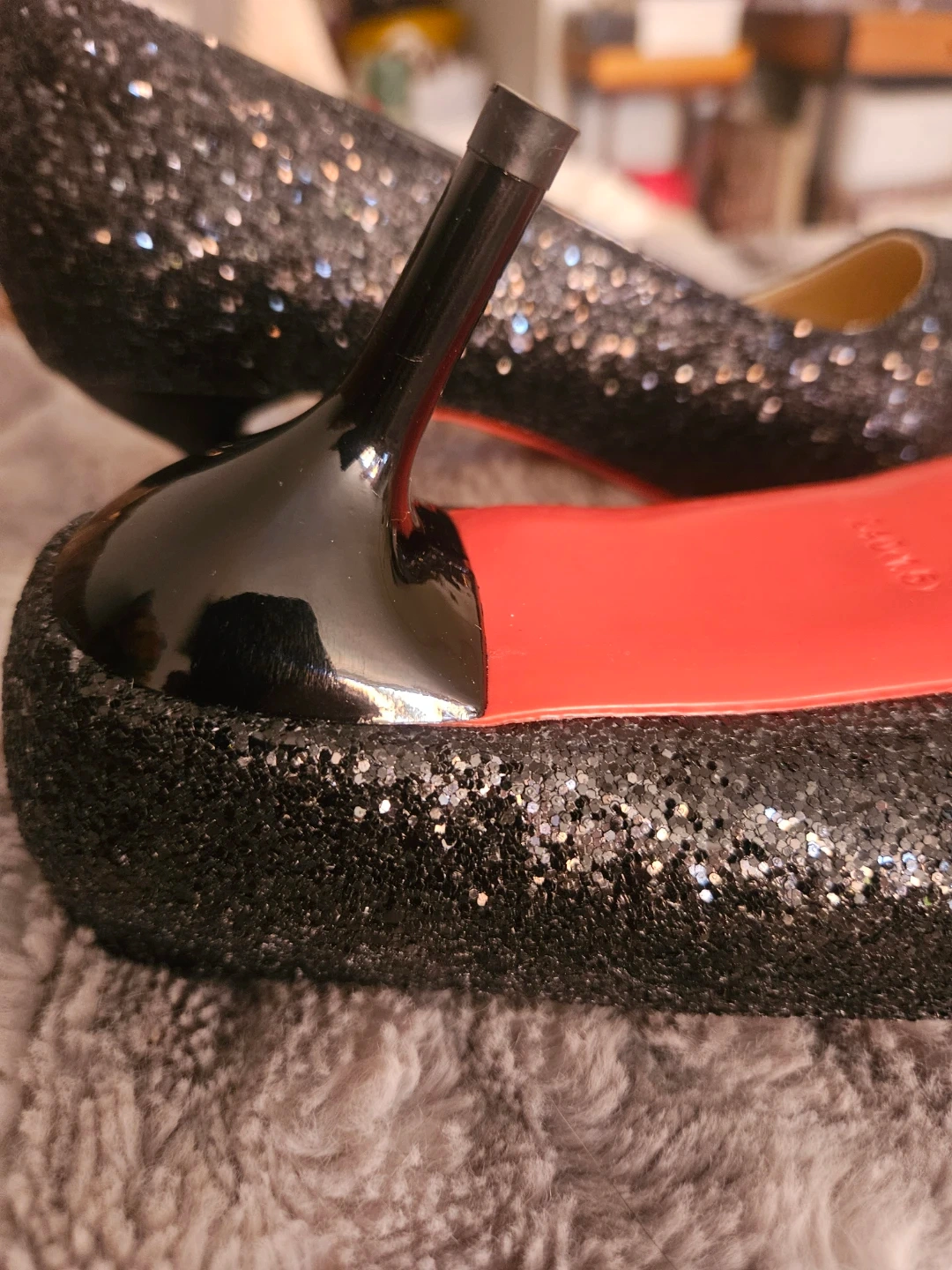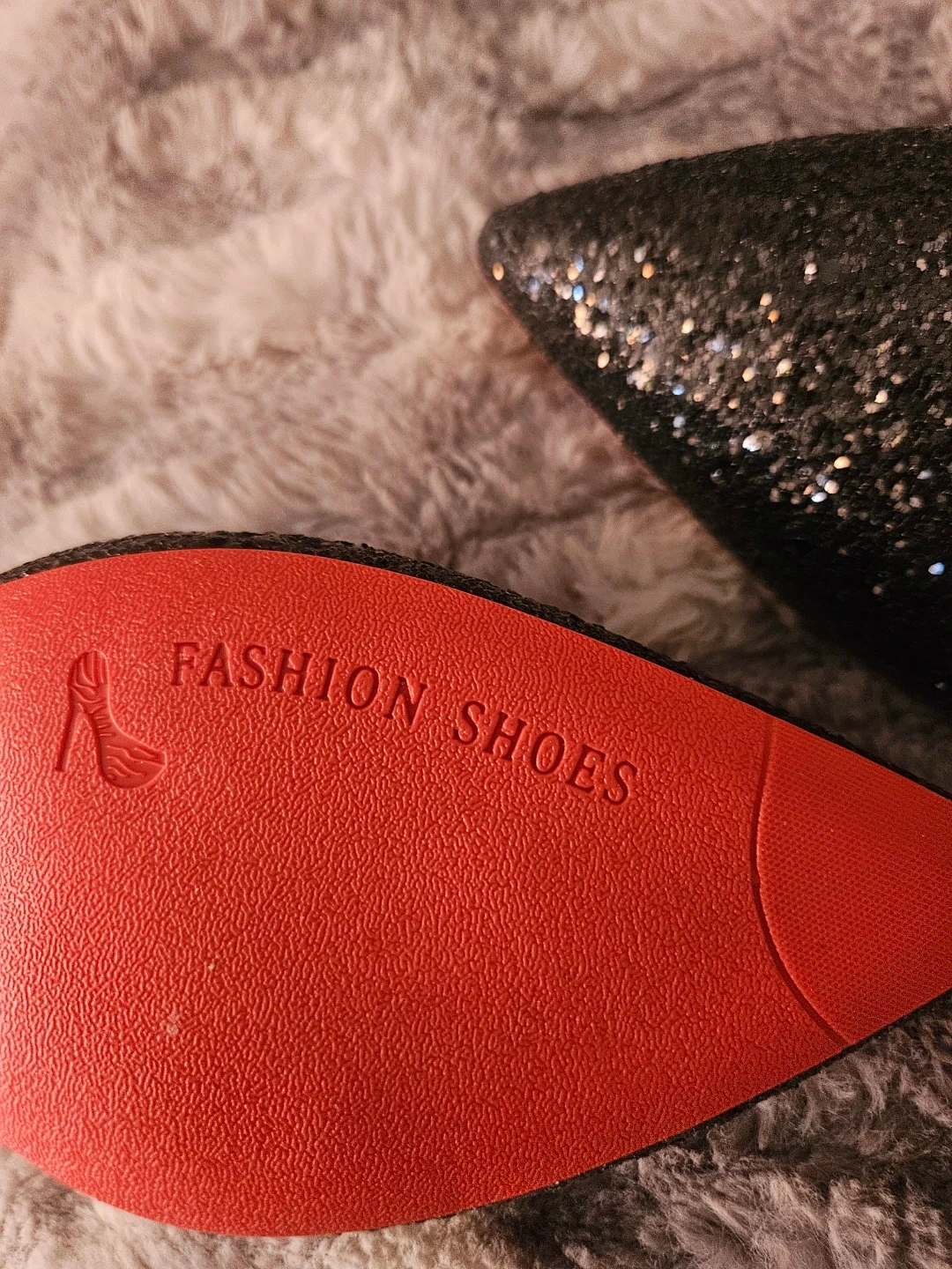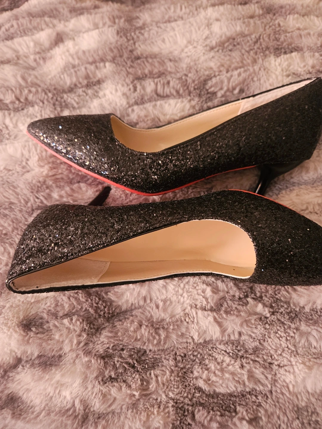 Sparkly black pointed toe heels. These fashion shoes have a classic red sole. Heel height is approximately 2.5 inches. Perfect for a night out!