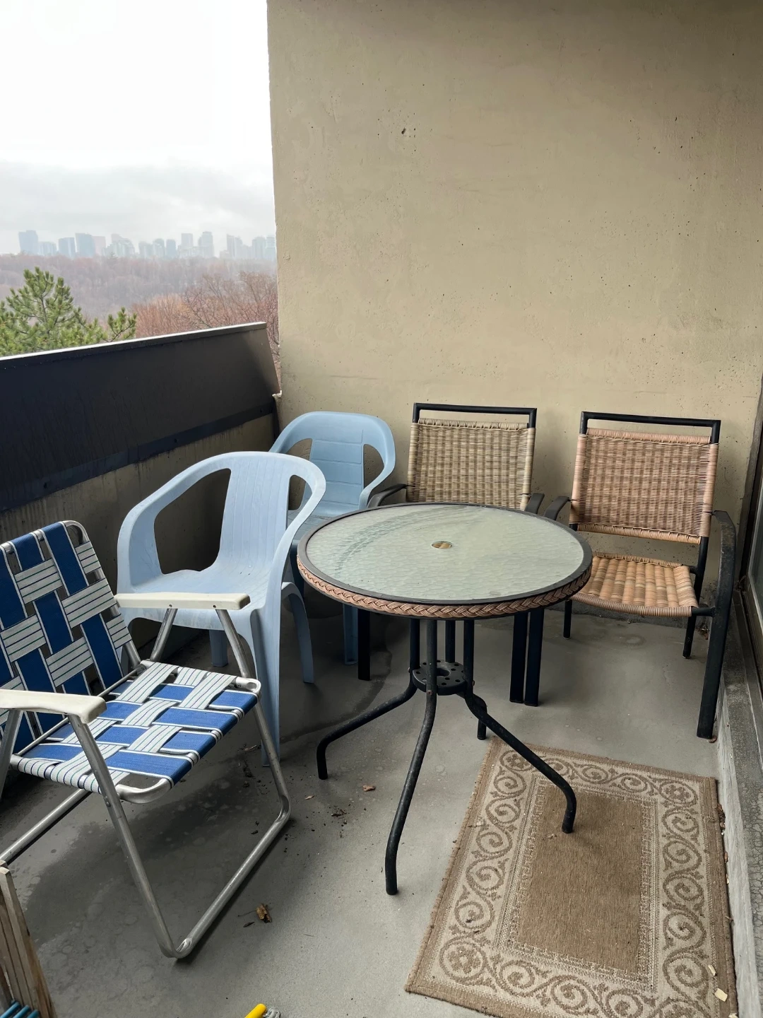 Round glass-top patio table, two woven-style chairs and two solid plastic chairs and one folding camp-style chair. $25 for all prices wanted, or $10 for table and $5 per chair.