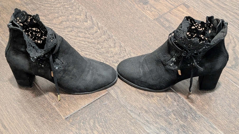 Cute black ankle boots featuring a unique lace detail around the top. They're a size 9 (40 EU) and have a comfortable heel height. Perfect for adding a touch of elegance to any outfit!
