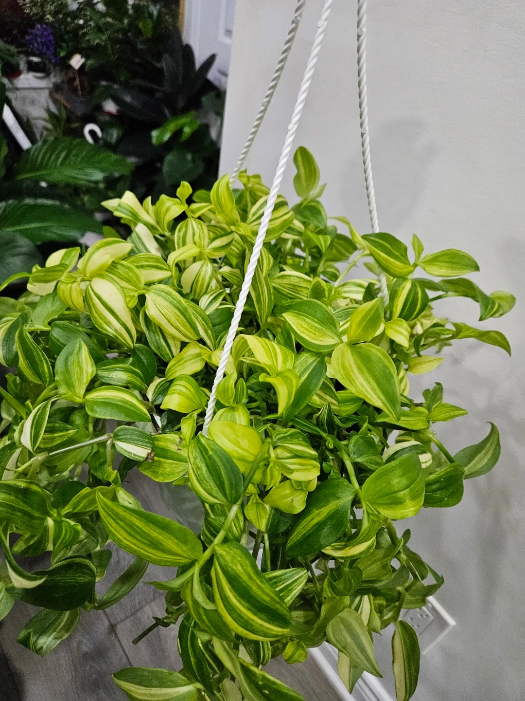 This is a lovely. Tradescantia variegated hanging plant. It's lush and green with beautiful yellow and white variegation on its leaves. It's a great choice for adding some life to any room!