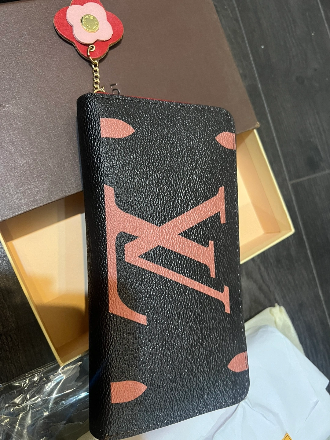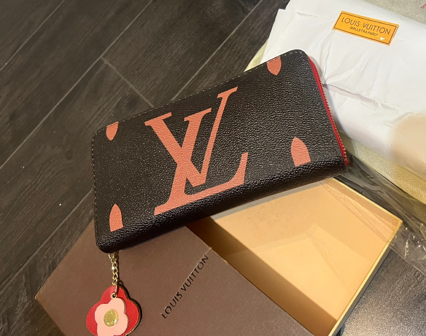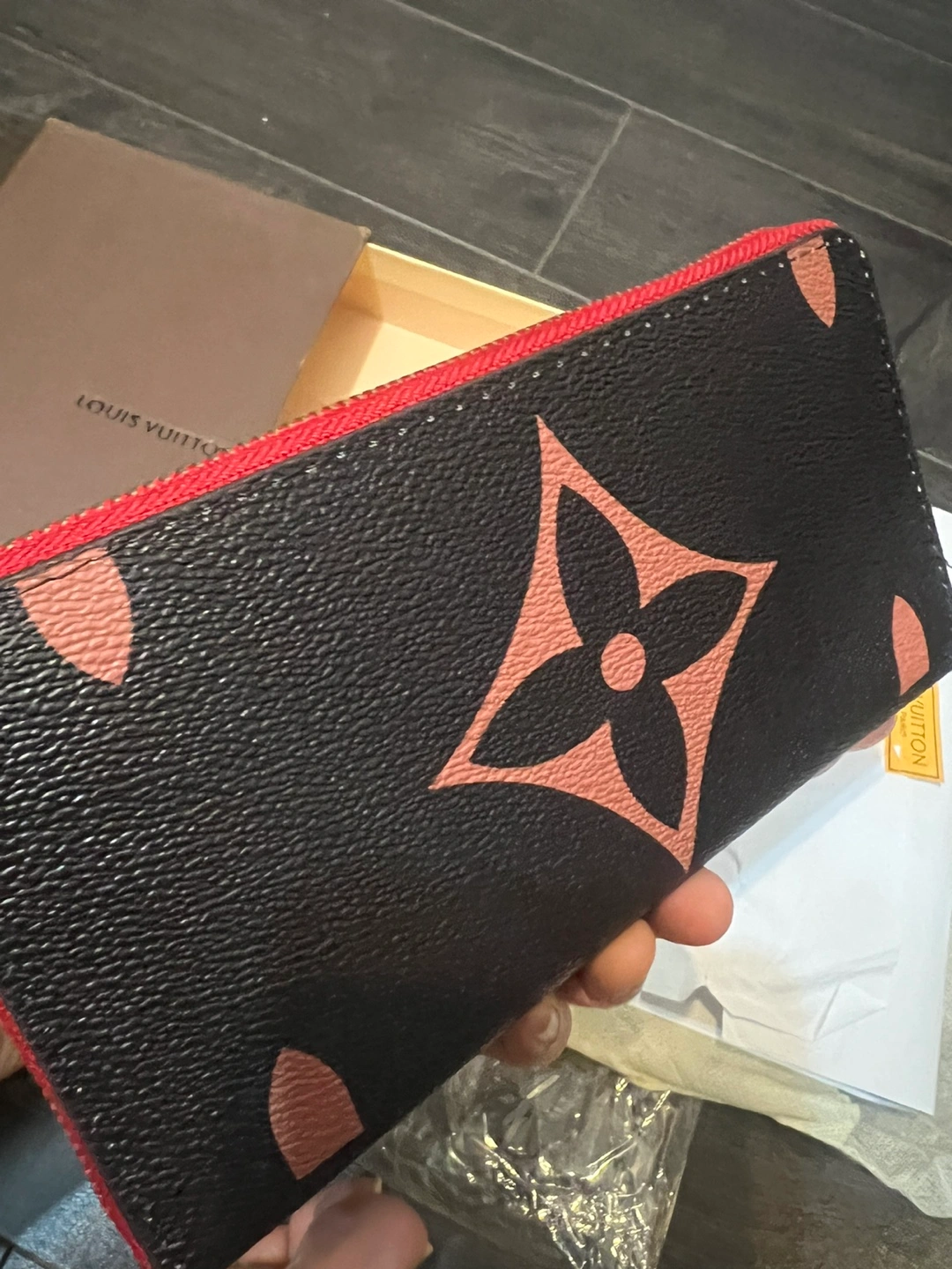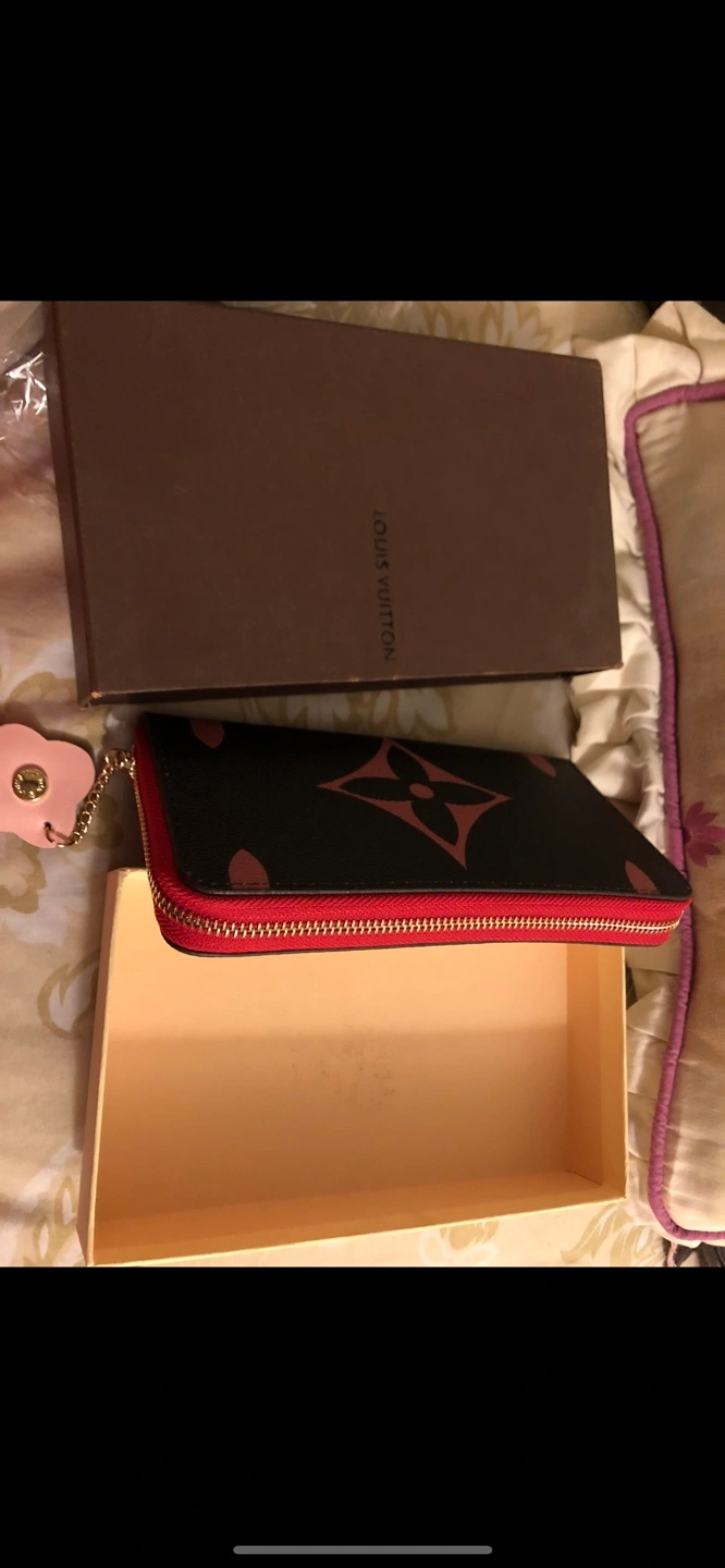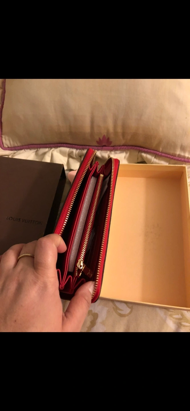 A Louis Vuitton zip-around wallet. Features the classic monogram pattern with a red zipper and lining. Includes original box and dust bag. This wallet is great for keeping your essentials organized.