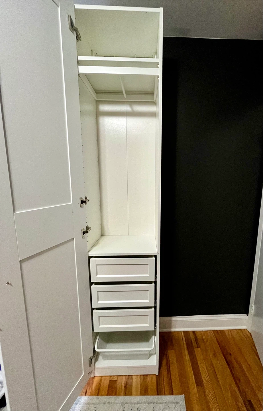 White IKEA PAX slim wardrobe with door, drawers, and hanging rail.