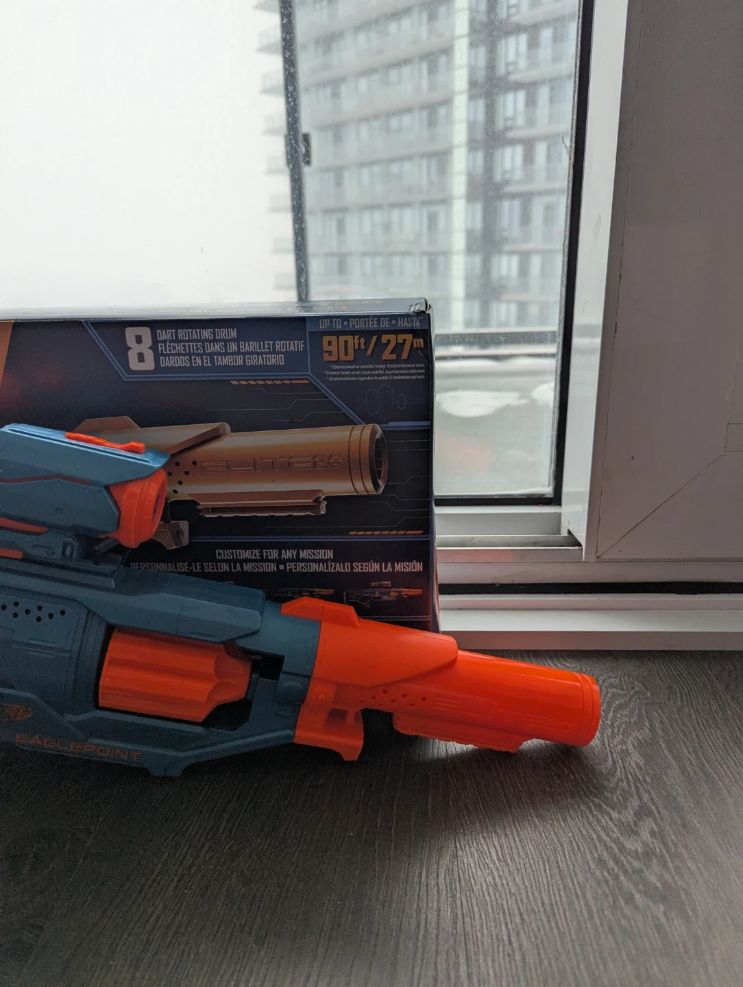 This is a Nerf Elite 2.0 Eaglepoint RD-8 blaster. It features a rotating drum for 8 darts. Comes with a scope attachment. The blaster is teal and orange plastic. Two best for a birthday gift for a 8+ year old boy, one never used and another lightly used.