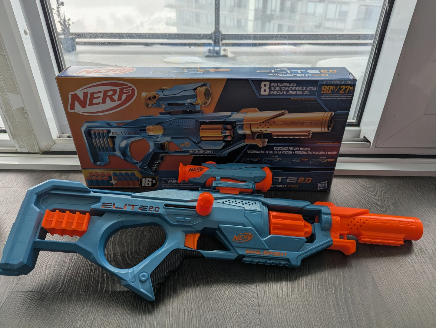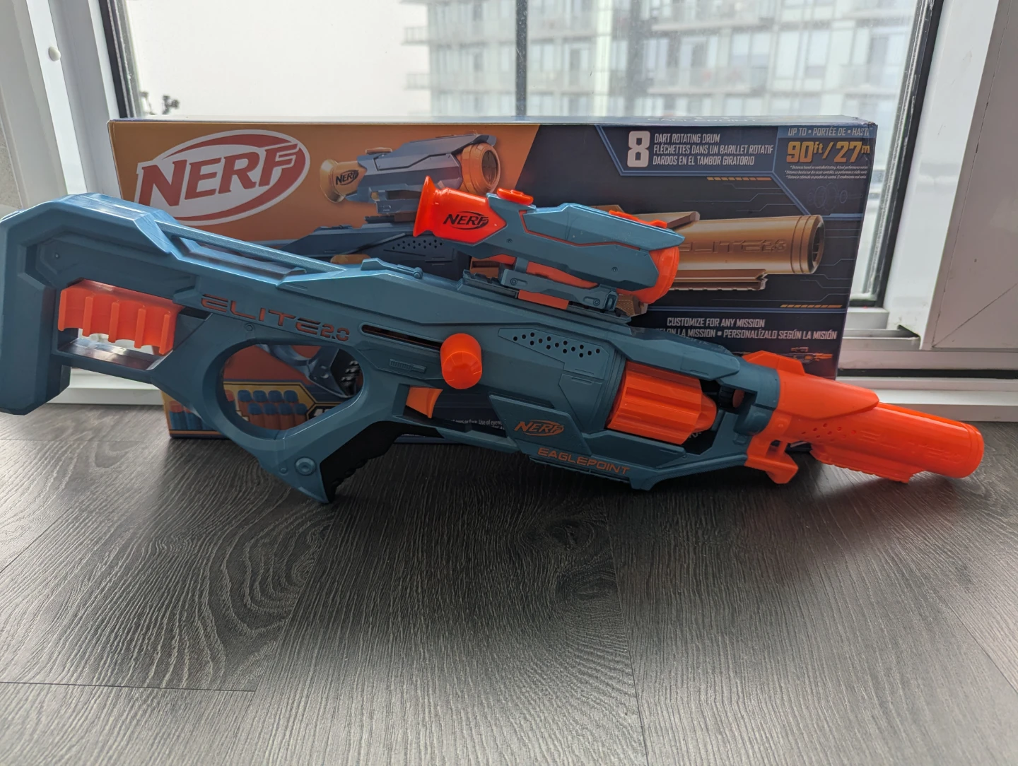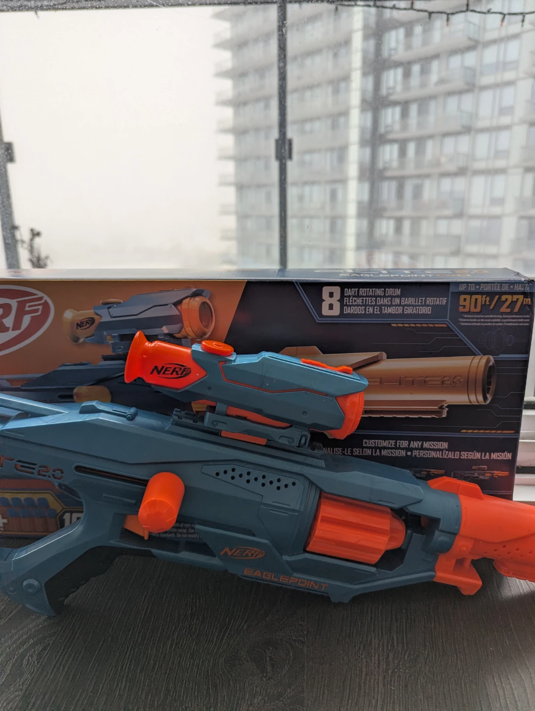 This is a Nerf Elite 2.0 Eaglepoint RD-8 blaster. It features a rotating drum for 8 darts. Comes with a scope attachment. The blaster is teal and orange plastic. Two best for a birthday gift for a 8+ year old boy, one never used and another lightly used.