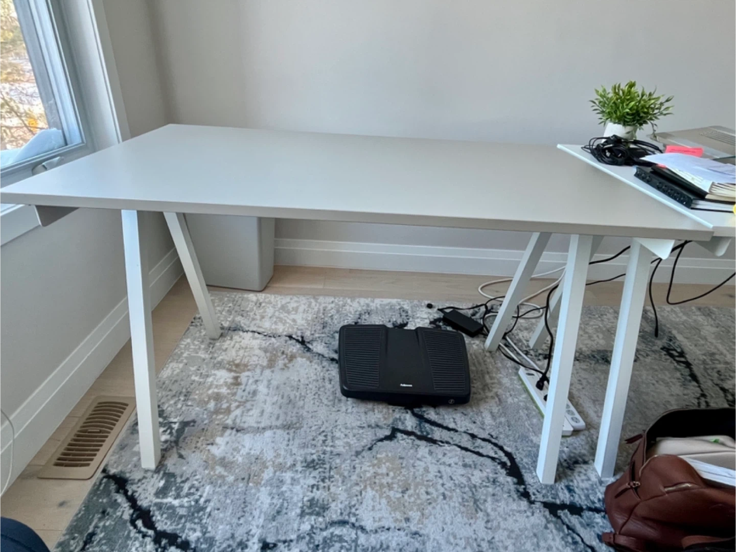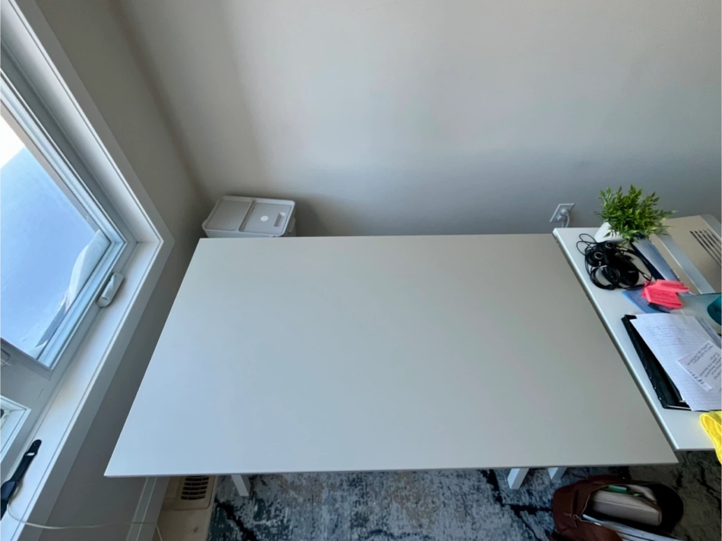 Simple white desk with a spacious surface. Its clean design fits any workspace. Legs are white and angled for stability. Perfect for home office or study room.