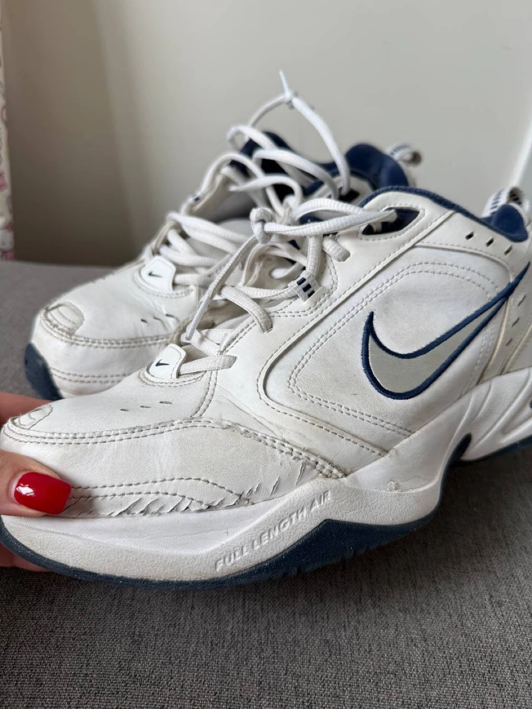 ✅ Selling a pair of Nike Air Monarch IV sneakers. They are white with navy blue accents and feature the classic Nike swoosh. Size US 12.