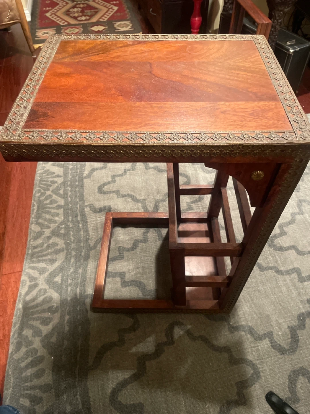 This side table features a beautiful wooden top with a decorative metal inlay around the edges. Its unique cantilevered base design allows it to slide under sofas or chairs. The wood has a rich, warm tone, and the metal trim adds an antique charm.