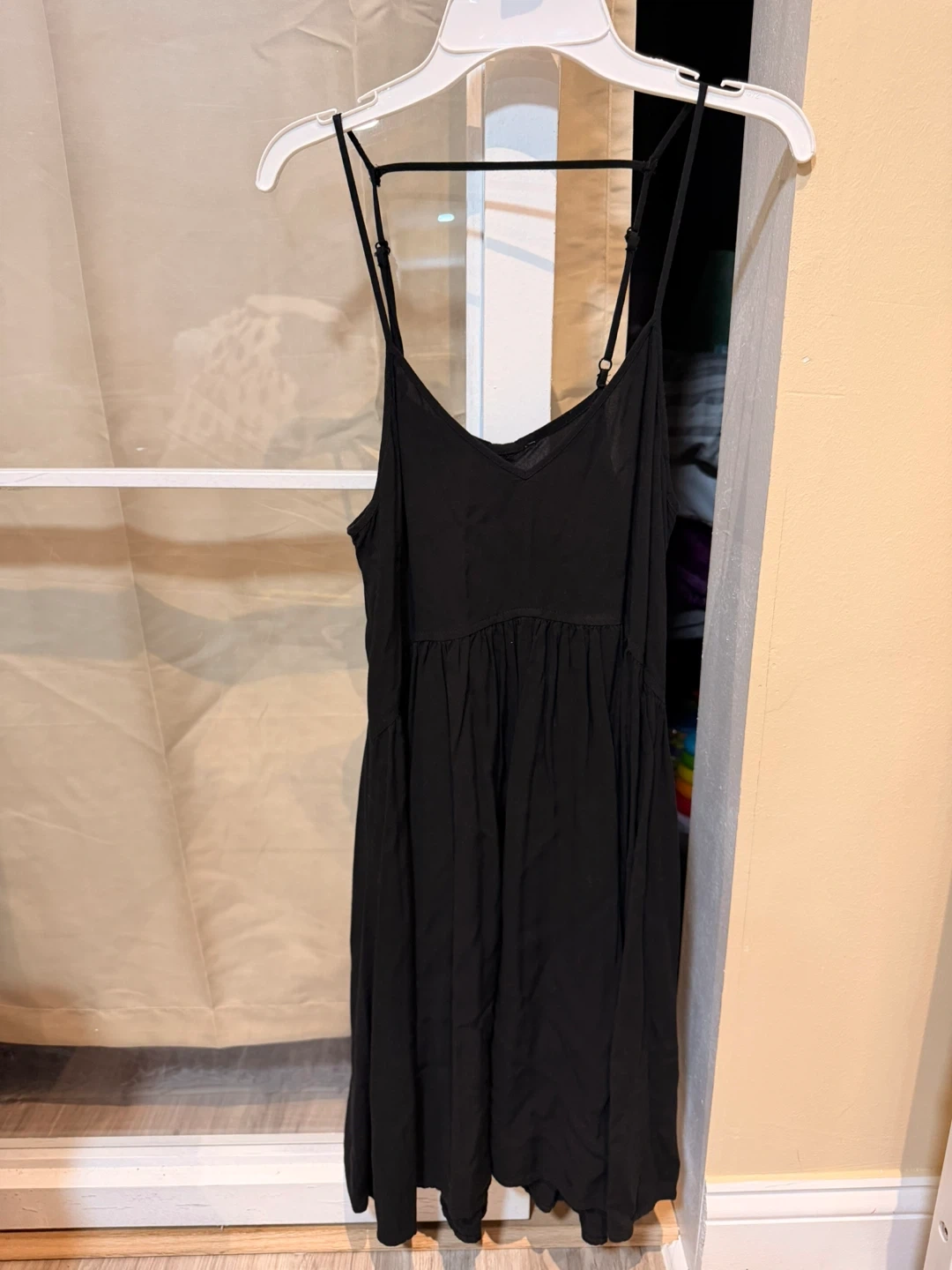 This black dress features thin spaghetti straps and a flattering V-neck. It has an elasticated empire waist with a flowy skirt. The material is lightweight and comfortable for warmer weather.