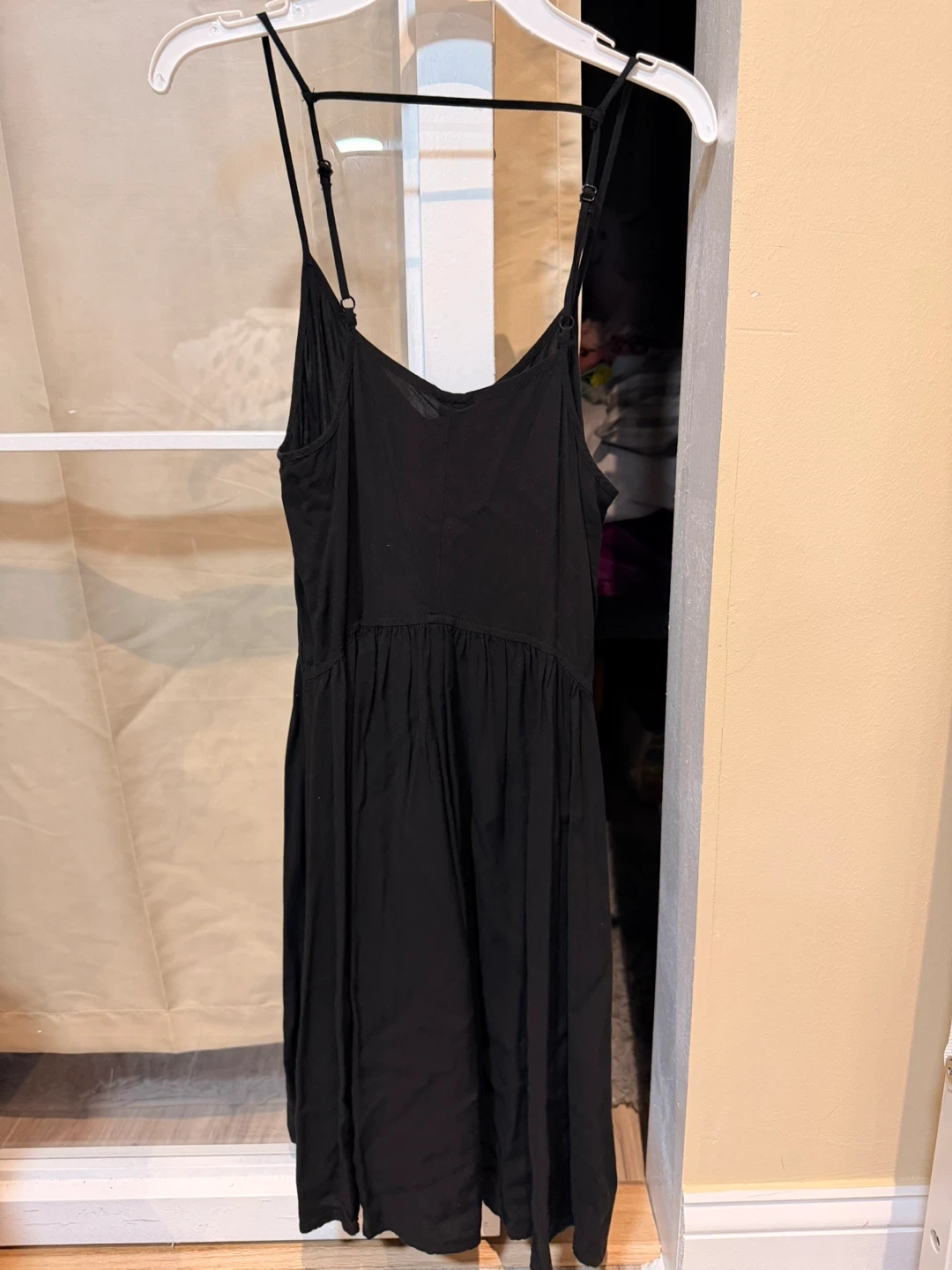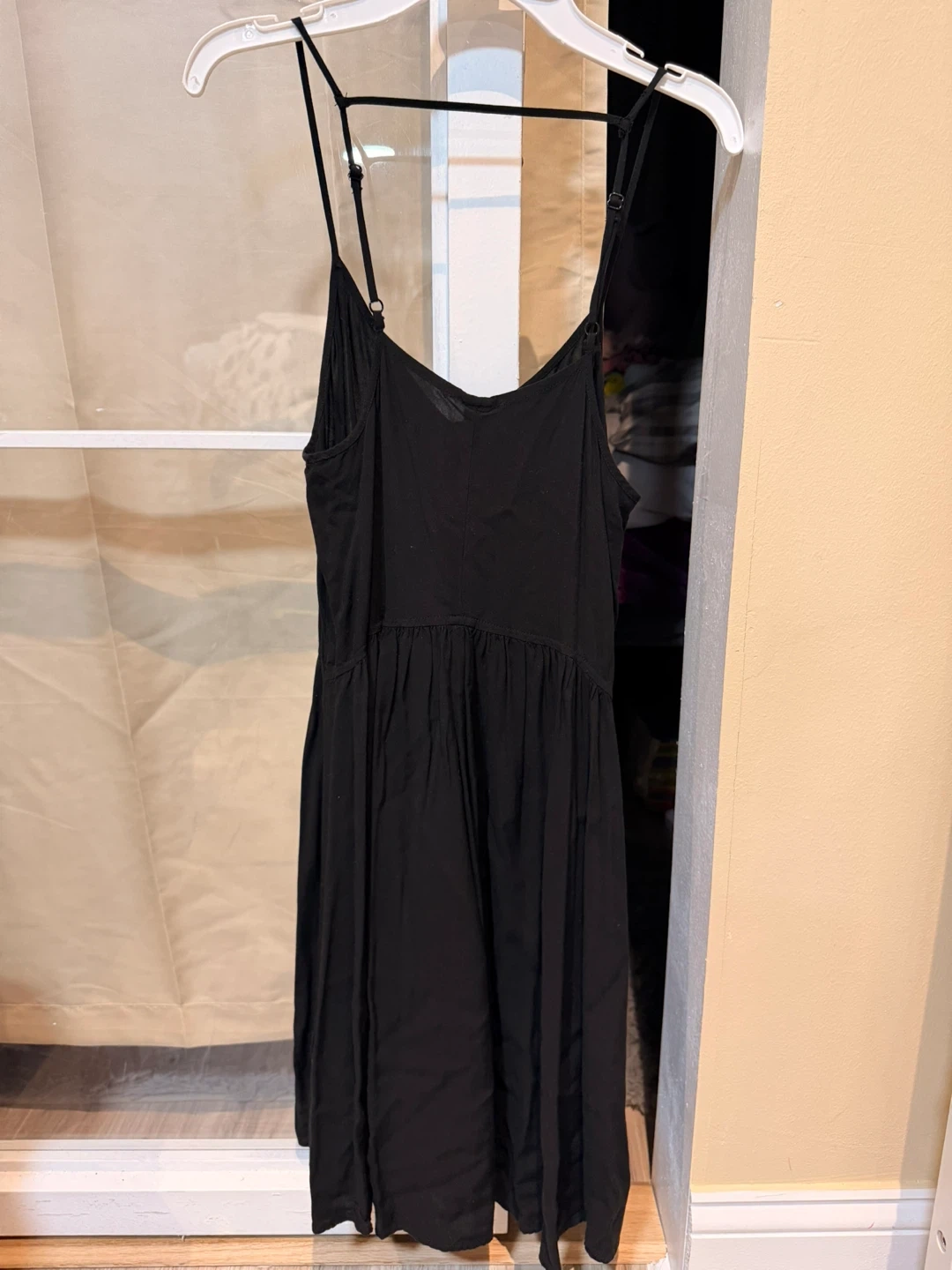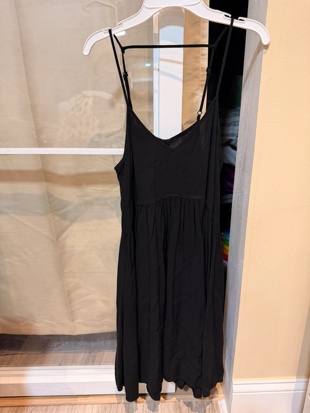 This black dress features thin spaghetti straps and a flattering V-neck. It has an elasticated empire waist with a flowy skirt. The material is lightweight and comfortable for warmer weather.