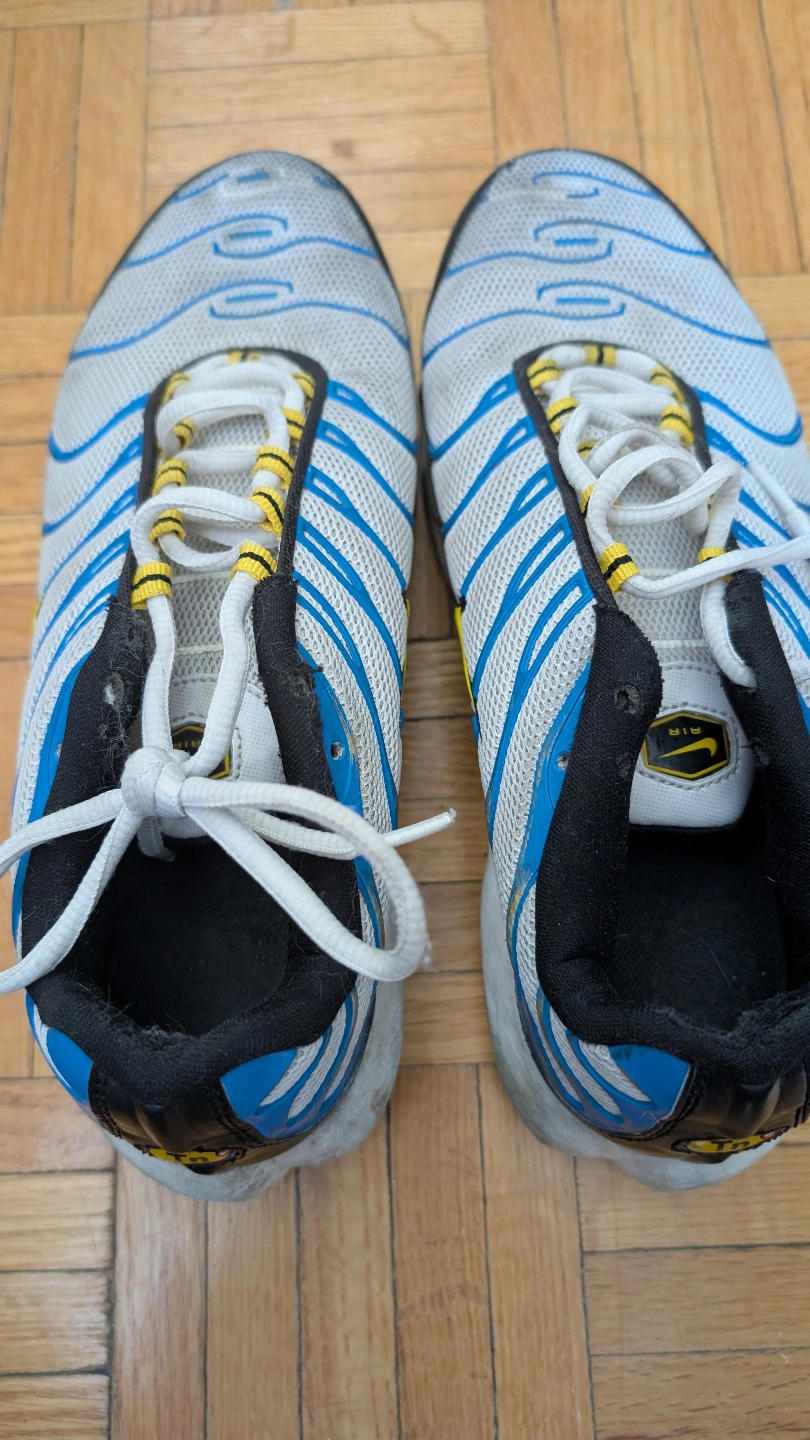 Pre-owned Nike Air Max Plus TN running shoes. White, blue, and yellow colour scheme. Show some wear. Good for casual wear.