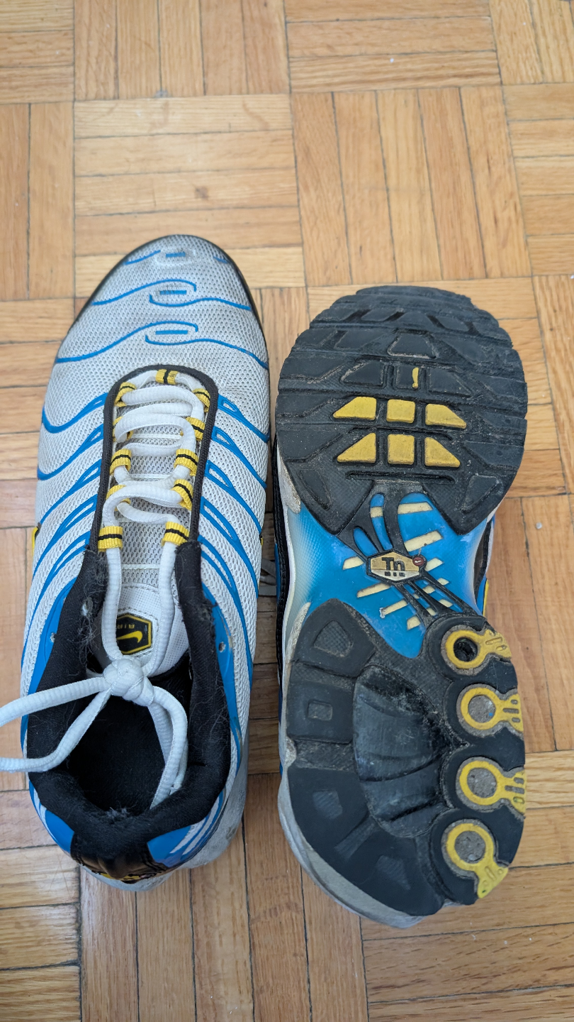 Pre-owned Nike Air Max Plus TN running shoes. White, blue, and yellow colour scheme. Show some wear. Good for casual wear.